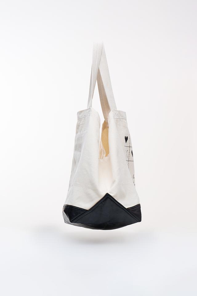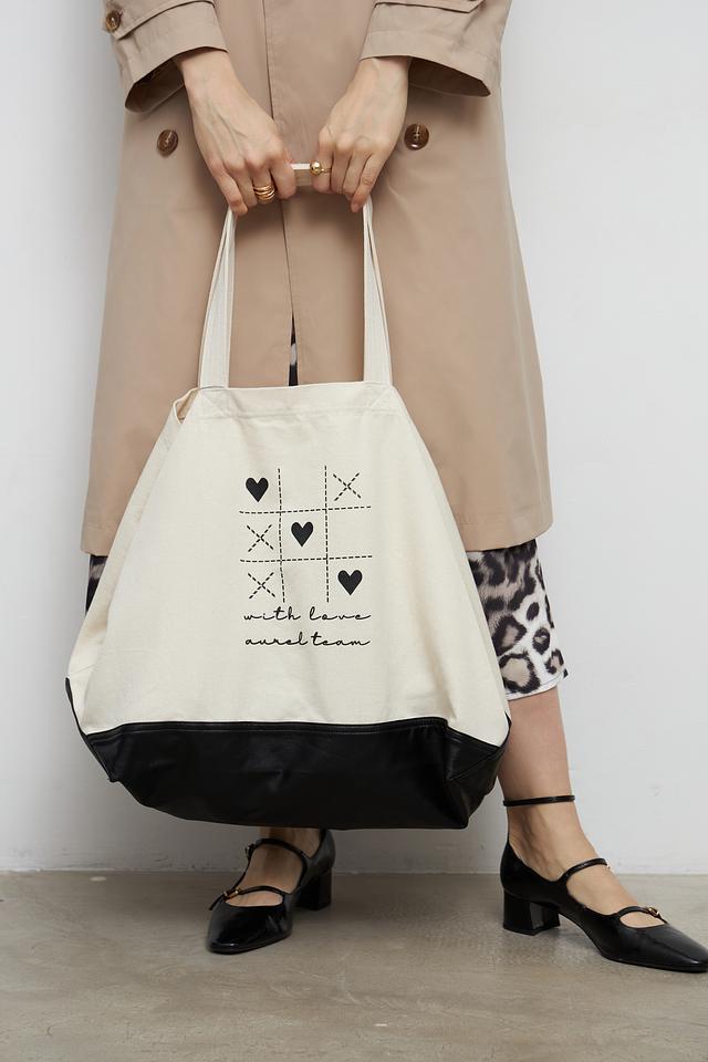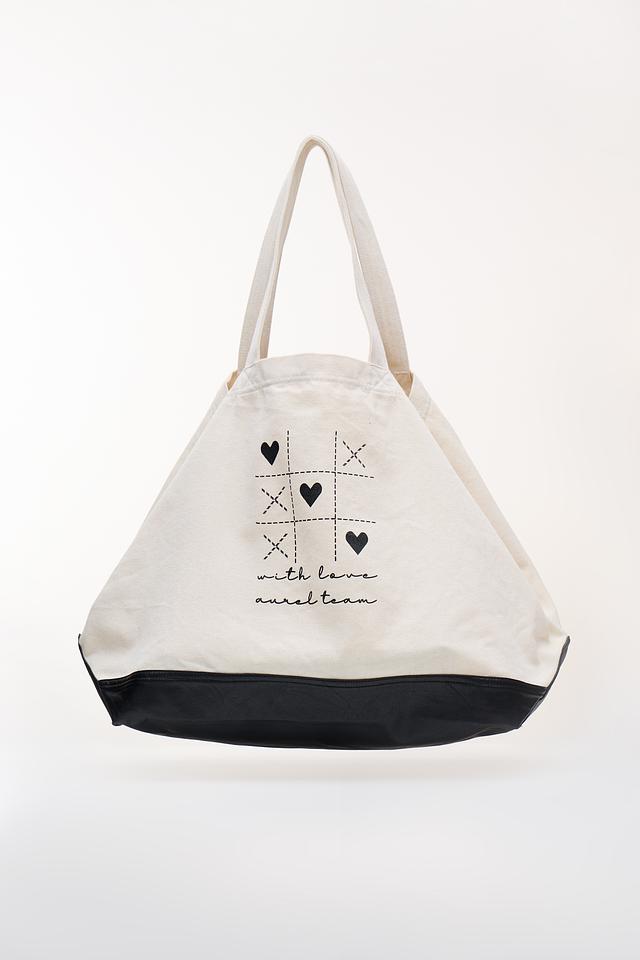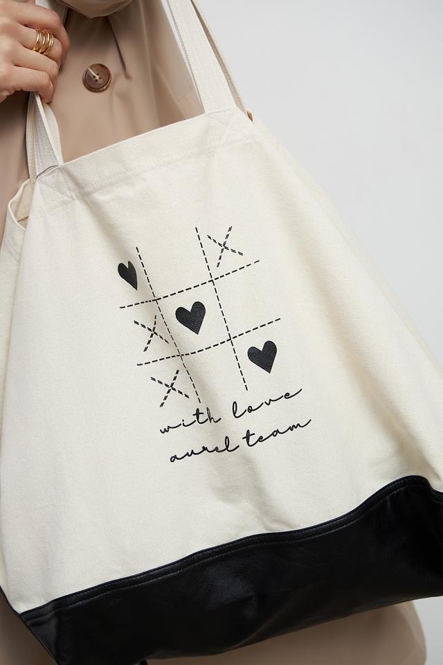 На передней панели сумки расположен принт, изображающий крестики и сердечки, выполненный в чёрном цвете. Подпись "with love aurel team" добавляет сумке индивидуальности.