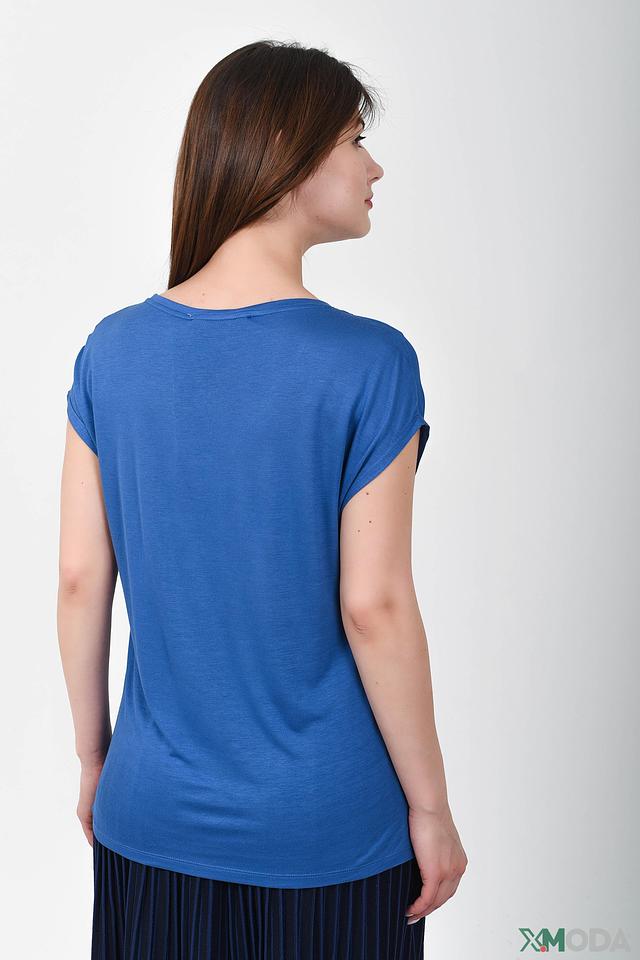 Фасон футболки свободный, с короткими рукавами, слегка задрапированными. V-образный вырез горловины подчеркивает женственность силуэта. Такая футболка идеально подойдет для создания повседневных образов, а также для особых случаев.