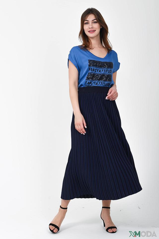 Основной цвет футболки – насыщенный синий. Модель украшена яркими черными пайетками, расположенными в виде полос и надписи "FANCY ATTITUDE". Этот декор придает изделию оригинальность и привлекает внимание.