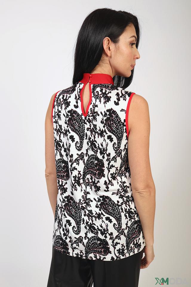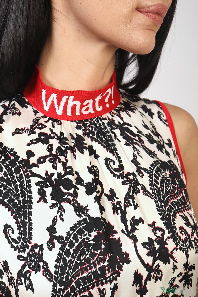 Особый акцент в дизайне топа – яркая красная вставка у горловины с надписью "What?!", которая добавляет образу дерзости и оригинальности. Вырез горловины оформлен стойкой, а отсутствие рукавов делает модель идеальной для теплой погоды.