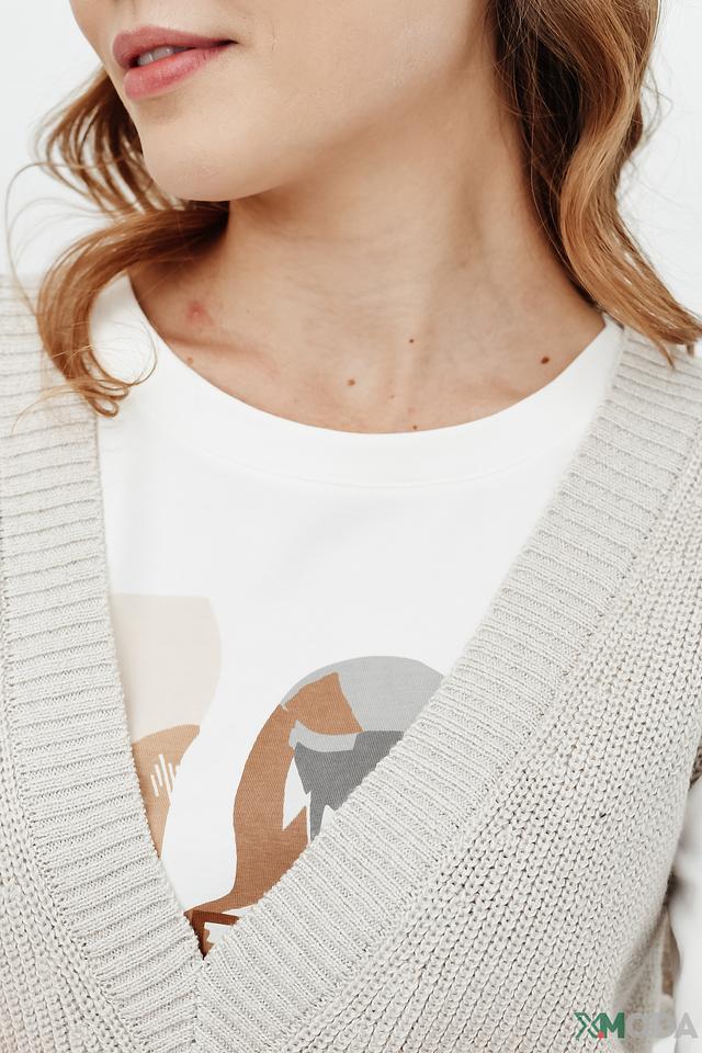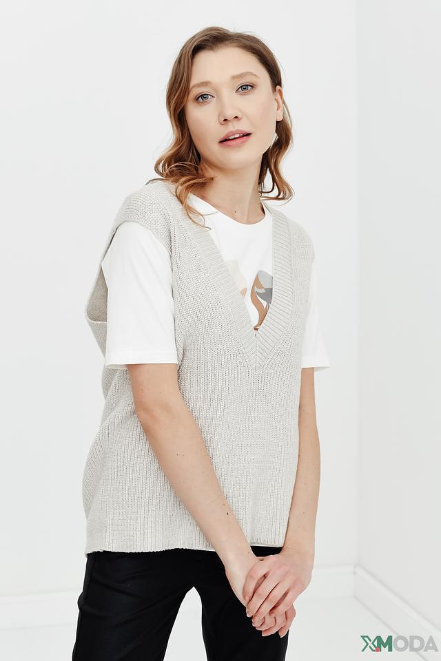 Жилет имеет классический крой с V-образным вырезом, который визуально удлиняет шею и делает образ более изящным. Бежевый цвет изделия универсален и легко сочетается с различными элементами одежды.