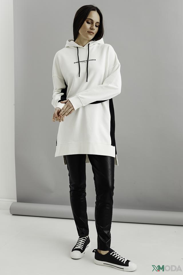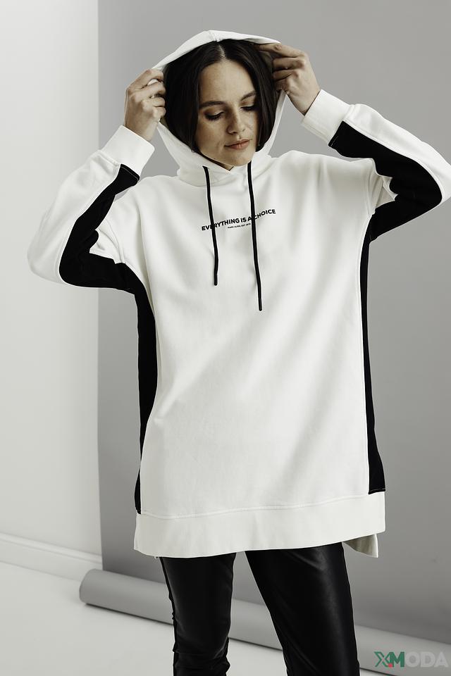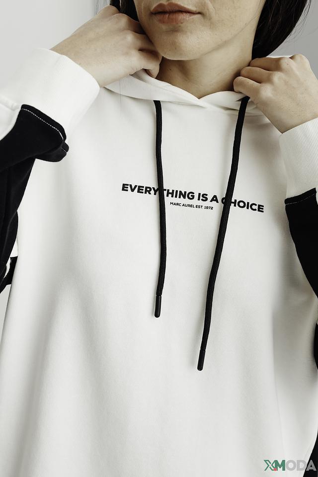 Белая толстовка Marc Aurel с черными вставками и надписью "EVERYTHING IS A CHOICE". Модель оверсайз с капюшоном и карманами, выполнена из мягкого хлопка с добавлением полиэстера. Состав: хлопок 87%, полиэстер 13%