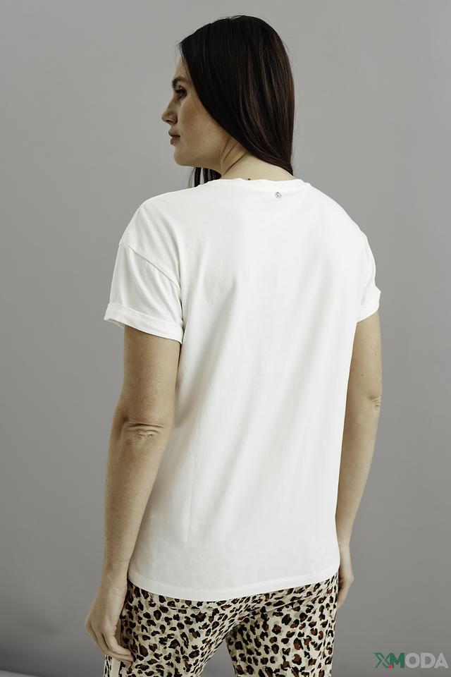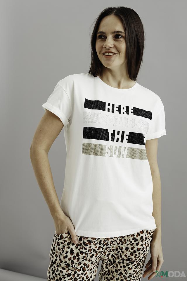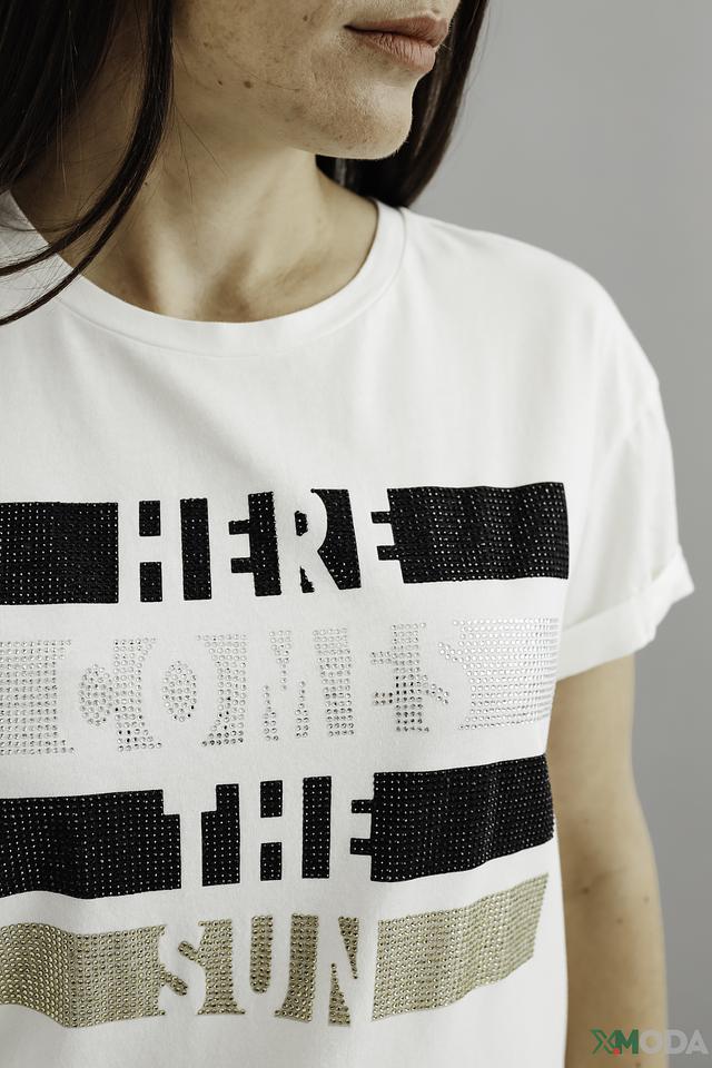 Особенностью данной модели является яркий принт с надписями, выполненный в черном, золотистом и сером цветах. Принт добавляет футболке оригинальности и позволяет создать стильный образ.