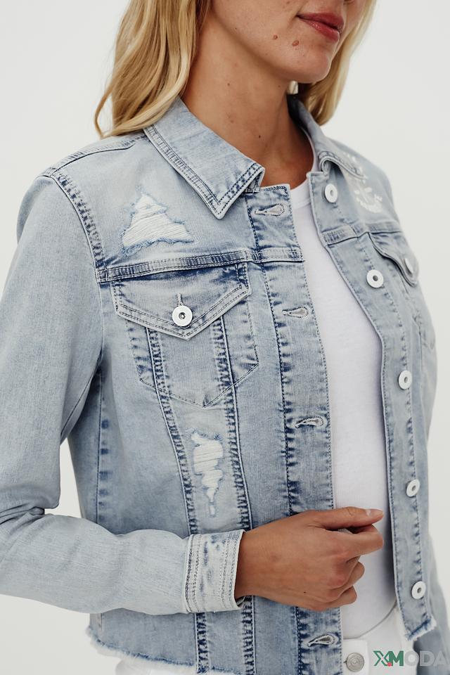 Модель имеет классический крой с длинными рукавами и застежкой на пуговицы. Отличительной особенностью является вышивка на плече, добавляющая образу оригинальности. Эффект потертости придает жакету непринужденный и современный вид.