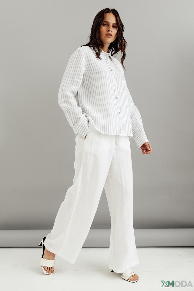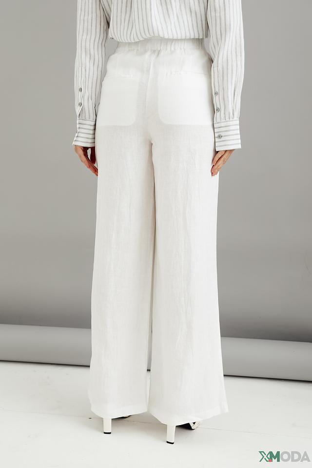 Брюки имеют прямой, широкий крой, который обеспечивает свободу движений и создает элегантный силуэт. Высокая посадка подчеркивает талию и визуально удлиняет ноги. Классический белый цвет легко сочетается с любой одеждой и обувью.