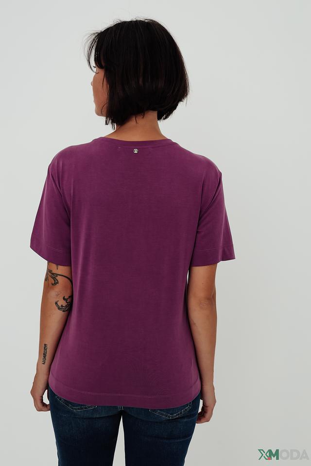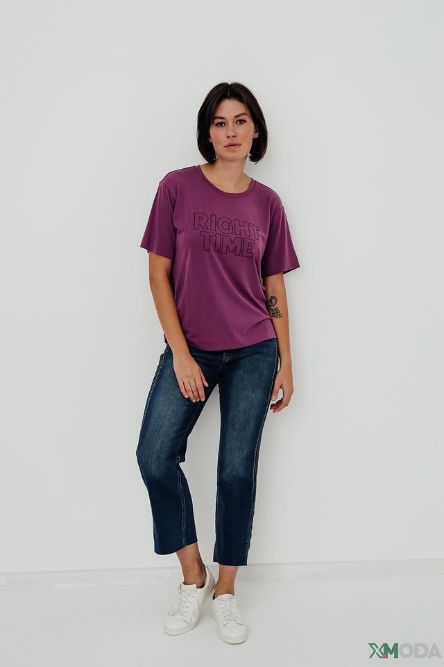 Футболка имеет прямой крой, который подходит для любой фигуры. Короткие рукава делают ее идеальным выбором для теплой погоды. Основной цвет изделия – насыщенный фиолетовый, который подчеркивает современный стиль.