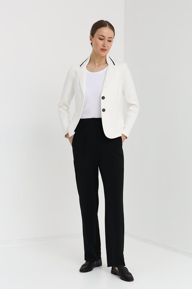 Жакет застегивается на две пуговицы, что обеспечивает удобство и надежность. Отличительной особенностью является контрастный кант по лацканам и по переду, добавляющий изюминку в дизайн. Накладные карманы добавляют практичности.