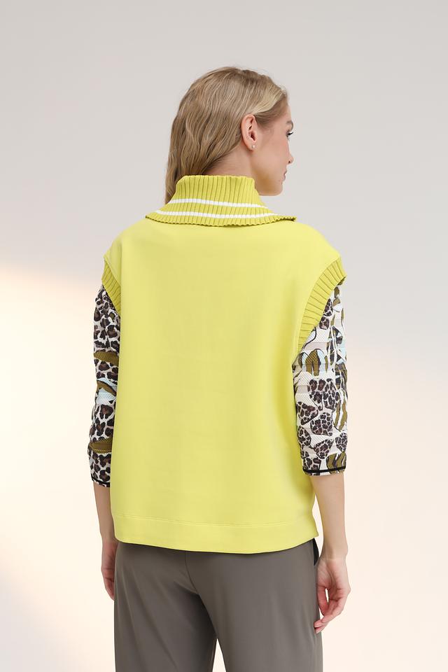 Женский жилет Marc Cain цвета лайм с оригинальным дизайном. Модель выполнена из мягкого хлопка с добавлением полиэстера и эластана, имеет застежку-молнию и вставки с леопардовым принтом. Состав: хлопок 88%, полиэстер 8%, эластан 4%