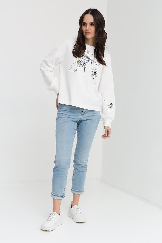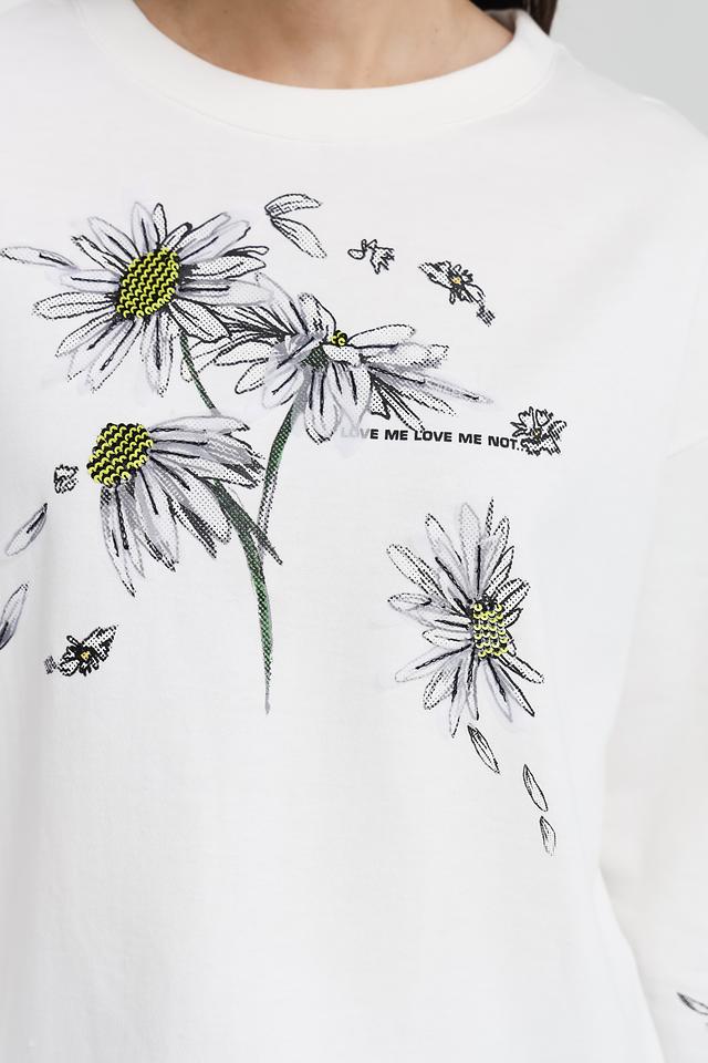 Толстовка украшена оригинальным принтом в виде ромашек, выполненным в графитовой гамме. Рисунок расположен на передней части изделия и на рукавах, добавляя образу свежести и легкости. Круглый вырез горловины и свободный крой обеспечивают комфортную посадку по фигуре.