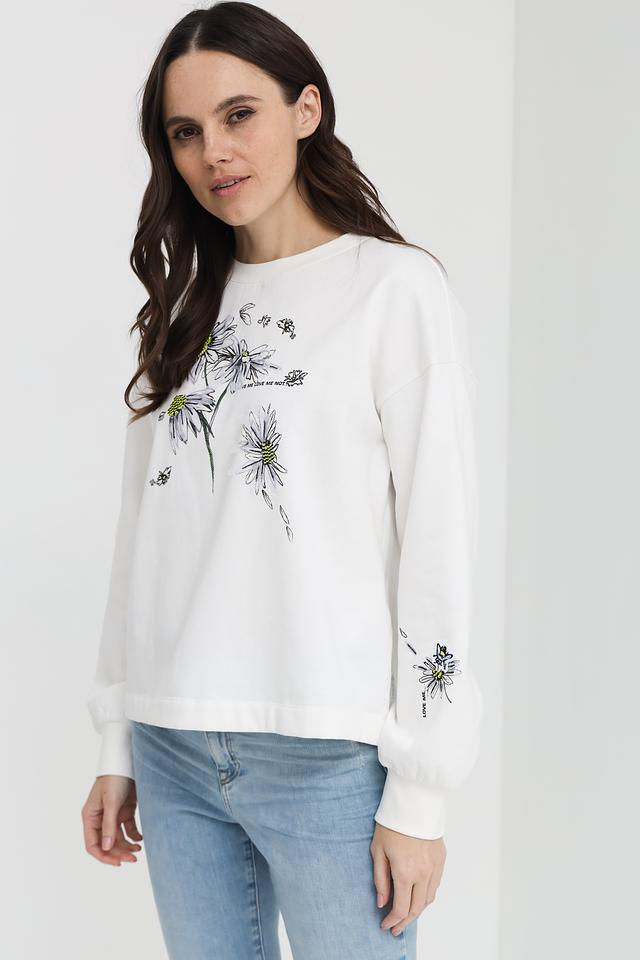 Белая толстовка Marc Cain с цветочным принтом – стильная и комфортная модель для повседневной носки. Изготовлена из мягкого хлопка с добавлением полиэстера, что обеспечивает удобство и долговечность изделия. Состав: хлопок 80%, полиэстер 20%