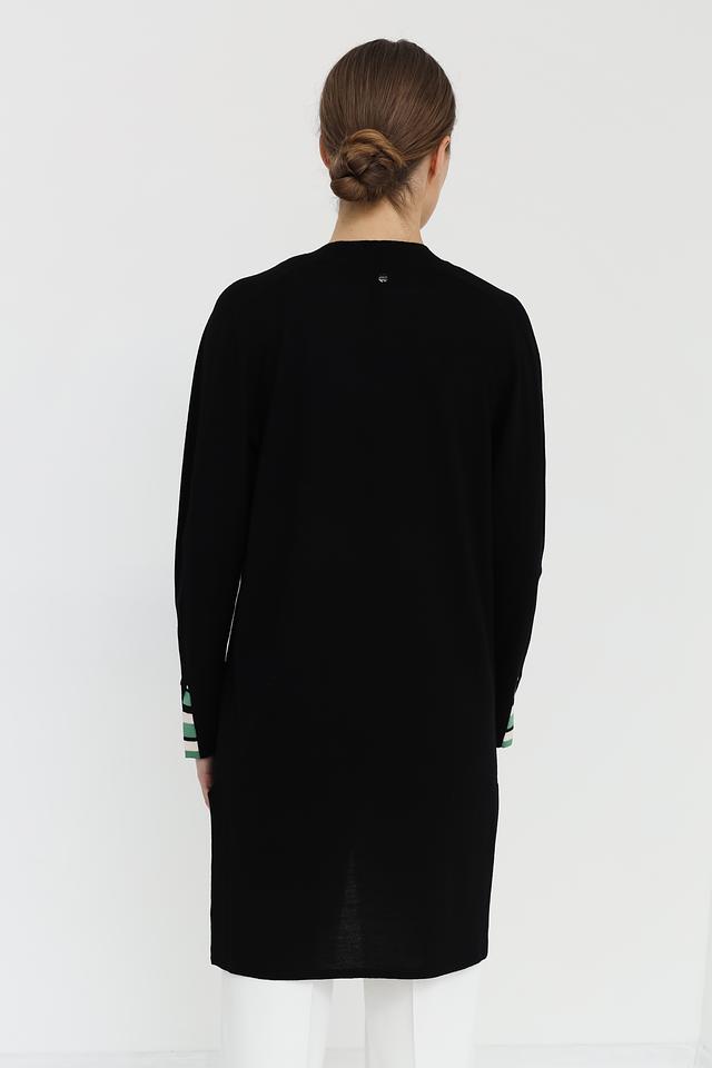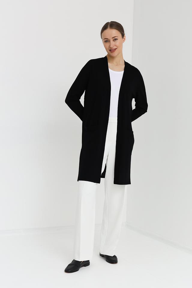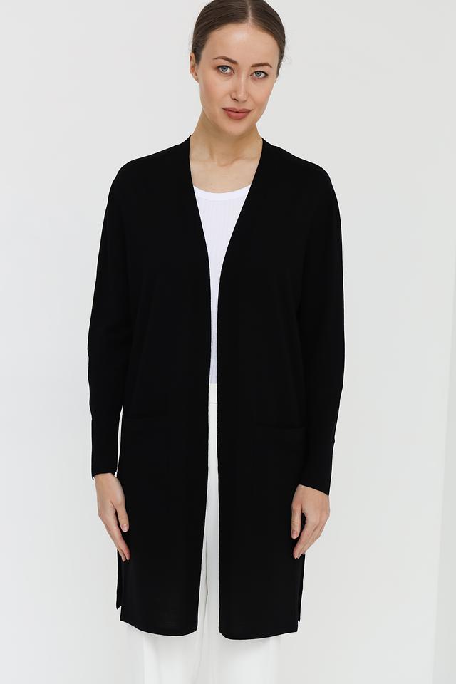 Чёрный кардиган Marc Cain из 100% шерсти – это элегантная и комфортная модель прямого кроя. Длинный силуэт и отсутствие застежки делают его идеальным для создания многослойных образов. Состав: шерсть 100%