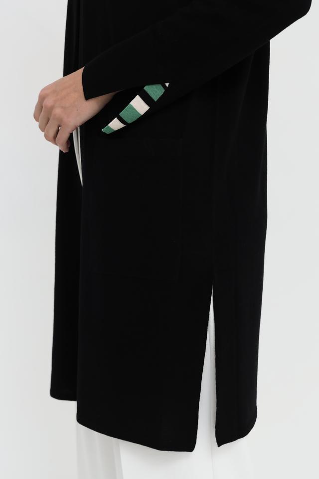 Модель имеет прямой крой, длинный силуэт и открытый фасад без застежек, что позволяет носить его поверх различных нарядов.