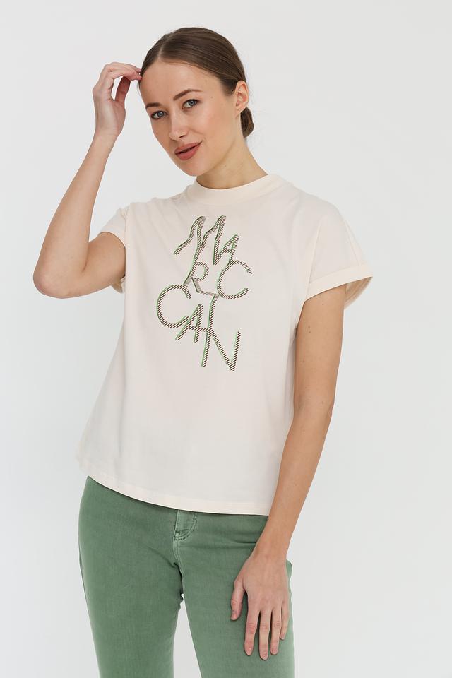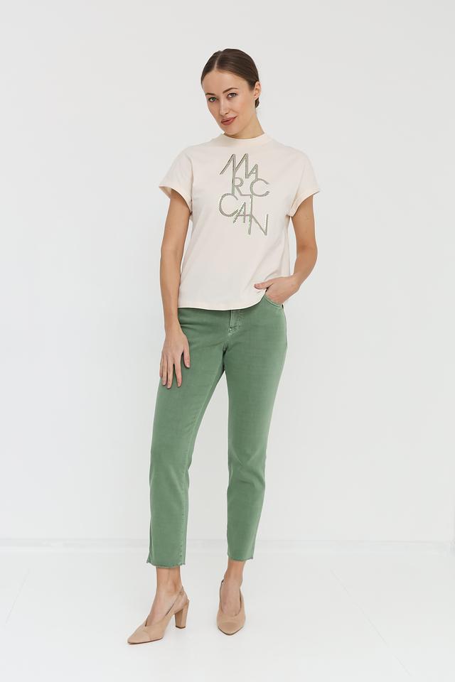 Модель имеет прямой крой и короткие рукава, что обеспечивает комфорт в жаркую погоду. Главной особенностью футболки является оригинальный логотип бренда, выполненный в виде надписи "Marc Cain" зелёного цвета с полосатым узором.