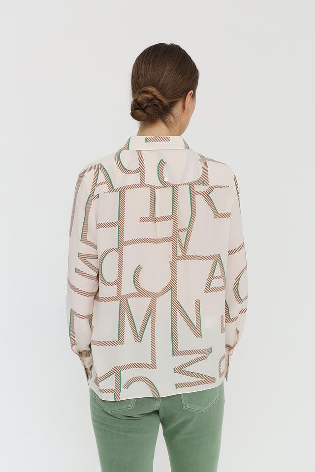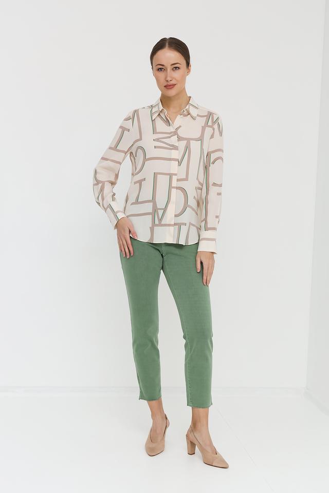 Эта стильная рубашка от Marc Cain станет прекрасным дополнением к вашему гардеробу. Выполнена в нежном бежевом цвете и украшена абстрактным геометрическим принтом в оттенках зелёного и коричневого.