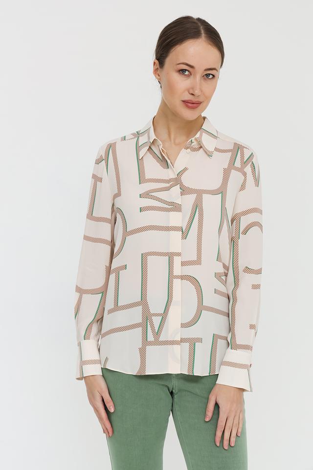 Бежевая рубашка Marc Cain с длинным рукавом и оригинальным геометрическим принтом. Изготовлена из сочетания вискозы и шелка, обеспечивающих комфорт и элегантный внешний вид. Состав: вискоза 66%, шелк 34%