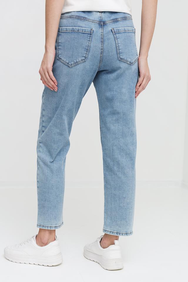 Джинсы имеют высокую посадку, прямой крой и классическую застежку на пуговицу. Отличительной особенностью являются вертикальные декоративные строчки, которые визуально вытягивают силуэт и придают джинсам оригинальный вид. Задние карманы классической формы.