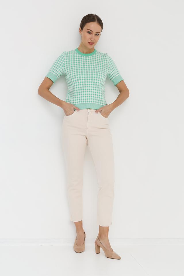 Джинсы имеют классическую посадку на талии, зауженный к низу крой и длину 7/8. Необработанный край придает образу непринужденность и современность. Пять карманов – два спереди и два сзади – обеспечивают функциональность.
