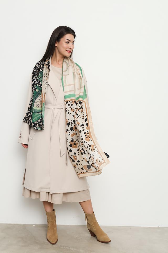 Шёлковый платок Marc Cain Collections в зелёно-бежевой гамме с ярким геометрическим и растительным принтом. Аксессуар станет стильным дополнением к образу и подчеркнёт индивидуальность. Состав: шелк 100%