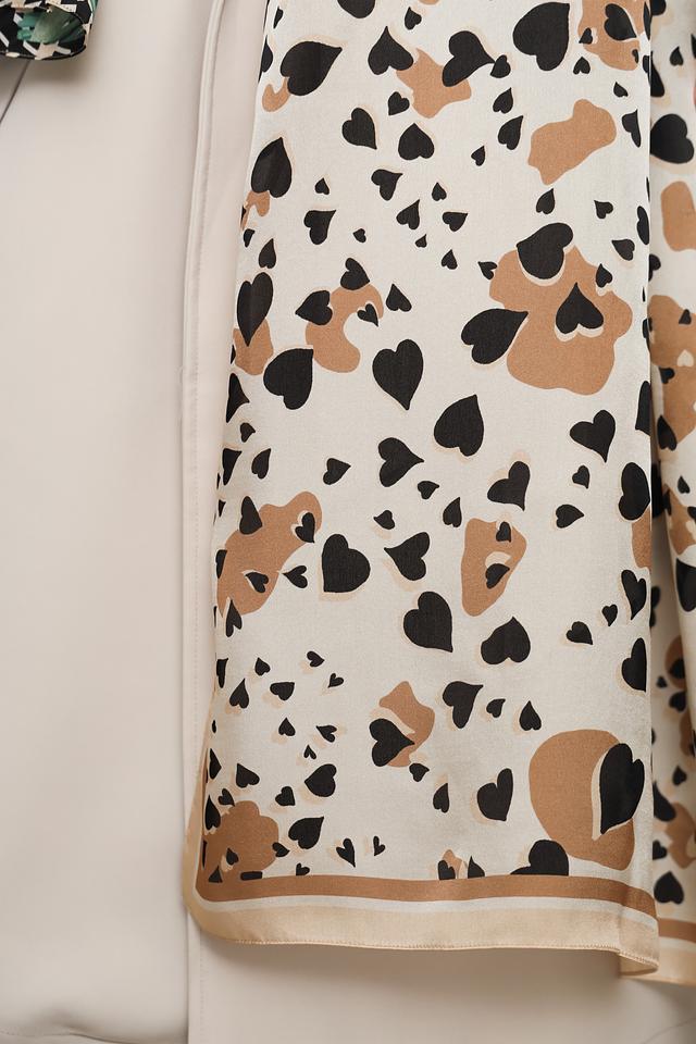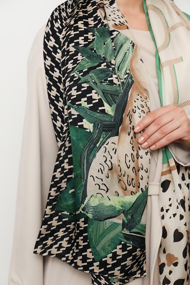 Дизайн платка сочетает в себе несколько принтов: геометрический узор в чёрно-белой гамме, абстрактные растительные мотивы в зелёных тонах и акценты в виде сердечек и пятен в бежево-коричневой палитре.