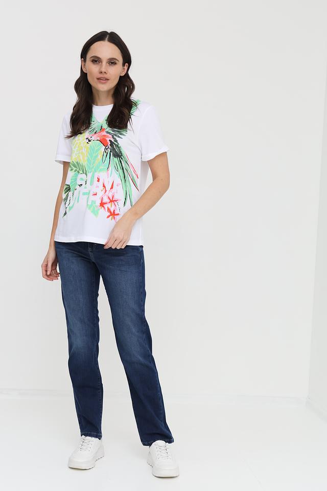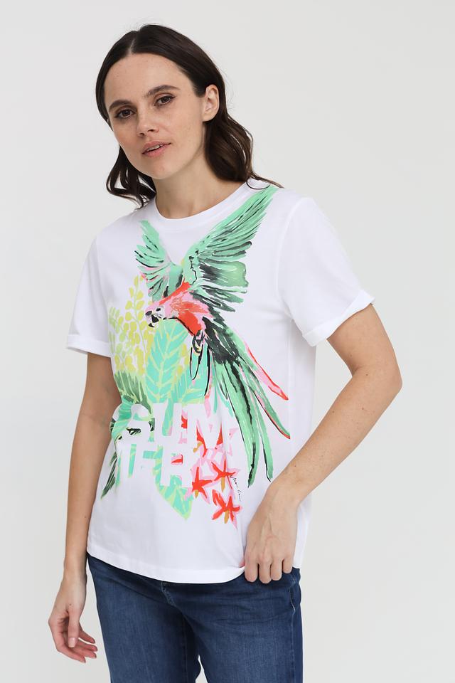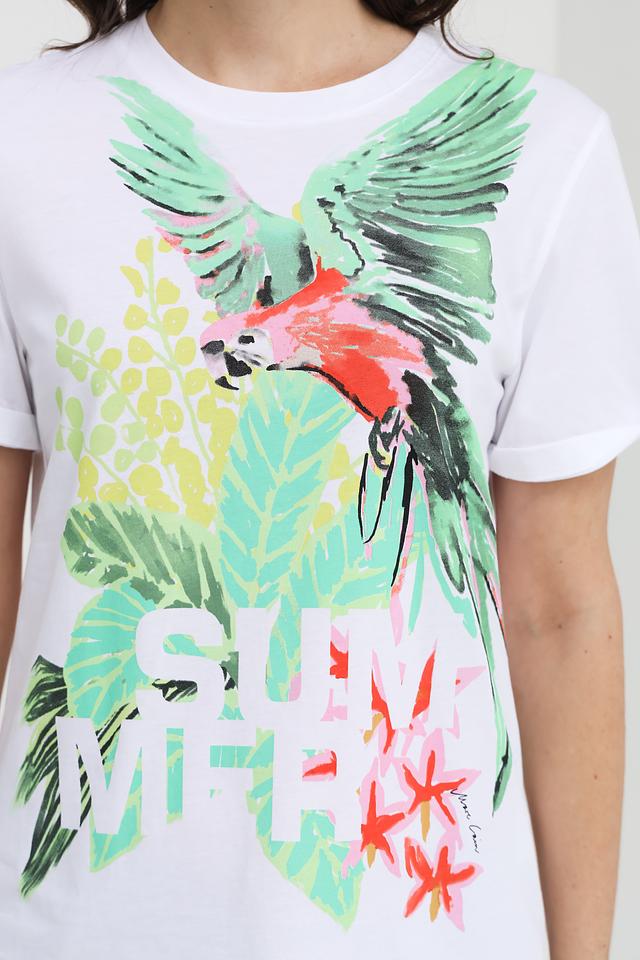 Белая футболка Marc Cain с ярким тропическим принтом в виде попугая и надписью "SUMMER". Изготовлена из 100% хлопка, обеспечивая комфорт и воздухопроницаемость. Идеальный выбор для создания летнего и стильного образа. Состав: хлопок 100%