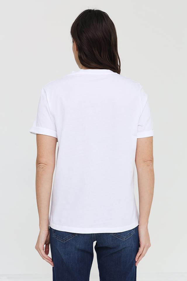 Футболка имеет классический прямой крой и короткие рукава, что делает ее универсальной для различных типов фигур. Она прекрасно сочетается с джинсами, шортами или юбками, создавая непринужденный и модный образ. Эта футболка станет отличным выбором для повседневной носки и летних путешествий.