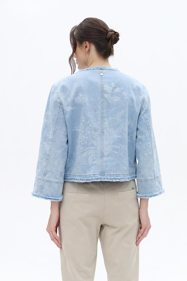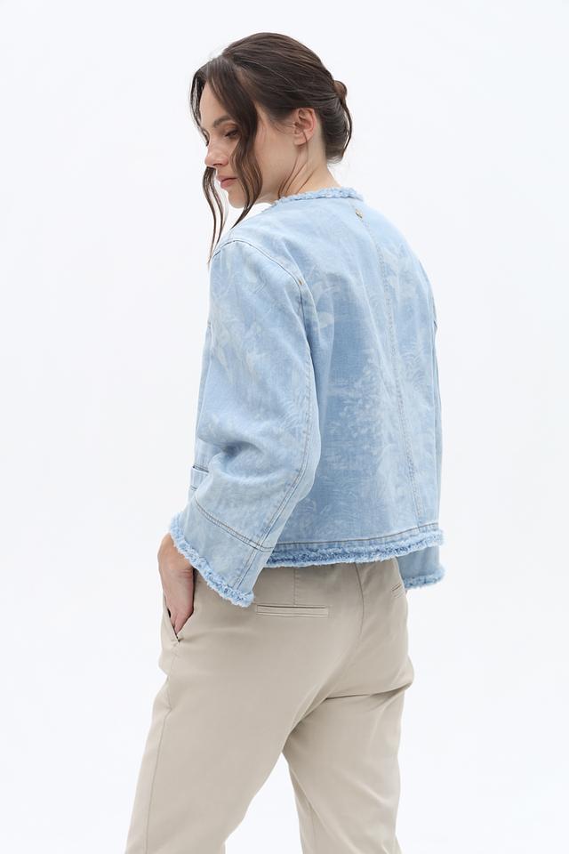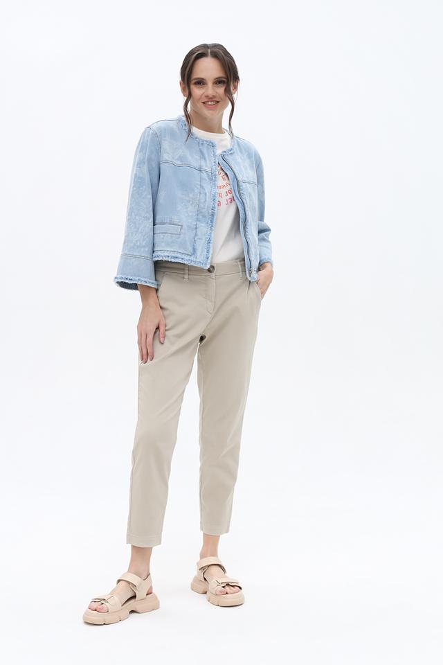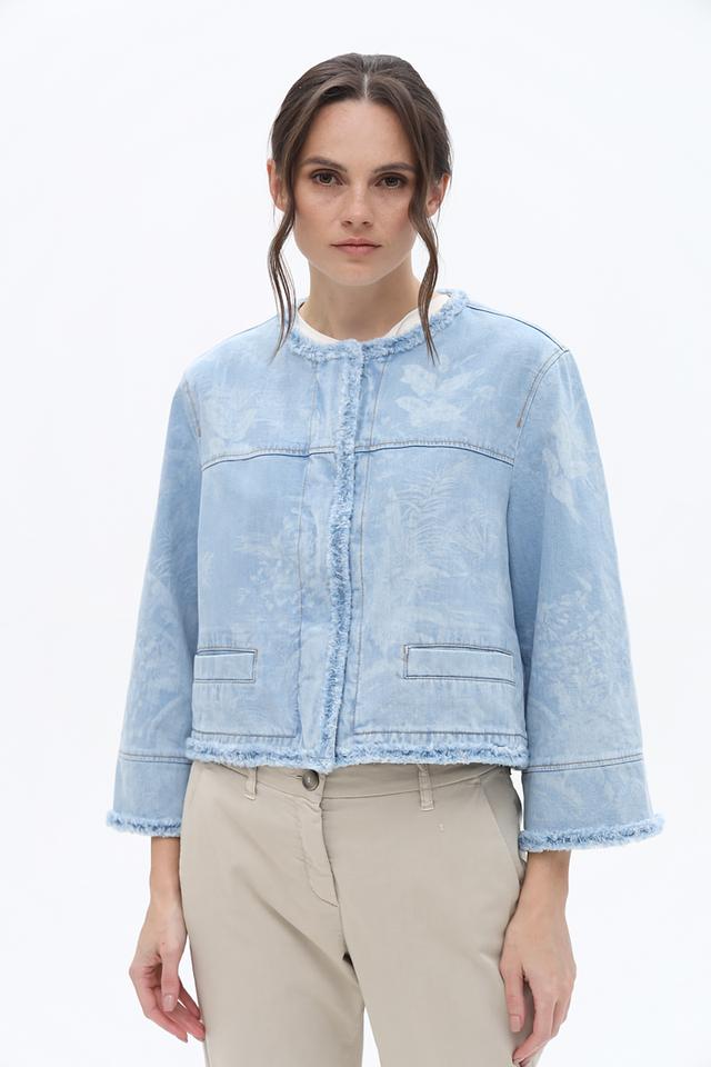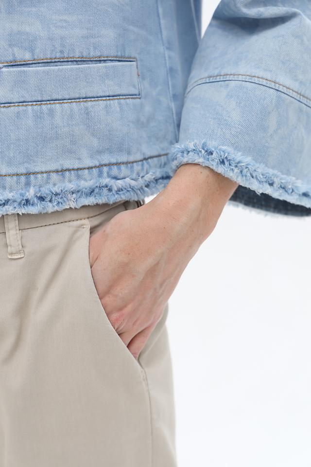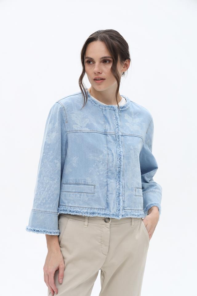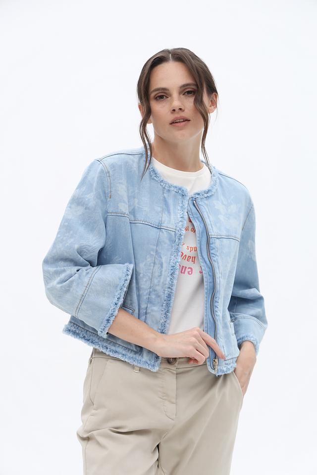 Жакет Marc Cain светло-голубого цвета выполнен из денима с эффектом потертости и декорирован бахромой. Модель застегивается на молнию и имеет короткие рукава, что придает ей легкий и непринужденный вид. Состав: хлопок органич. 99%, эластан 1%