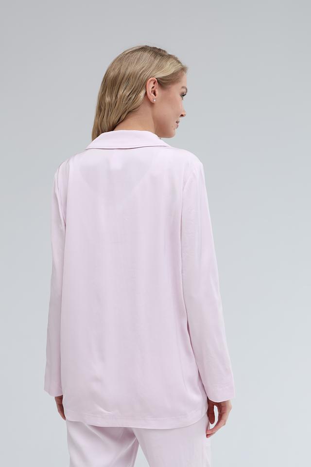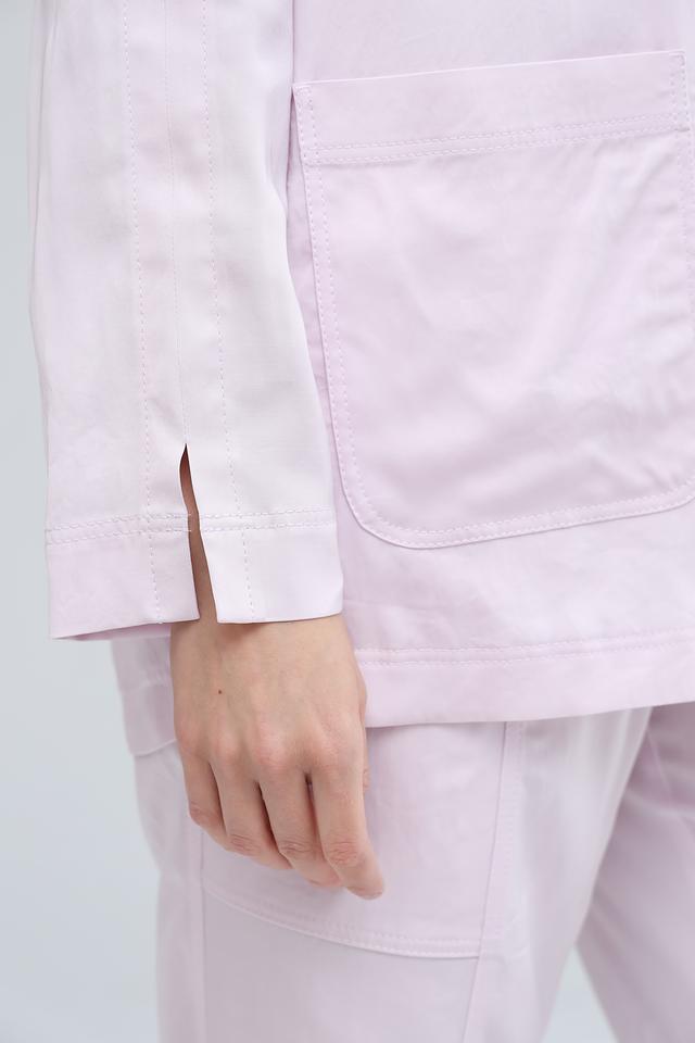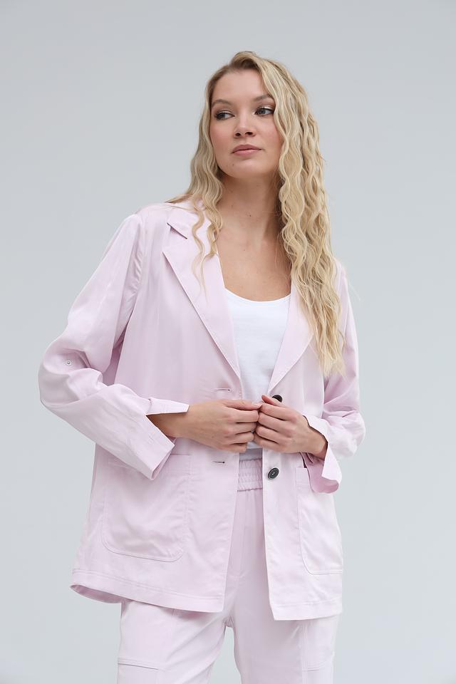 Модель отличается прямым кроем, лацканами и застёжкой на две пуговицы. Накладные карманы добавляют практичности и непринуждённости. Длинные рукава завершаются аккуратными манжетами.