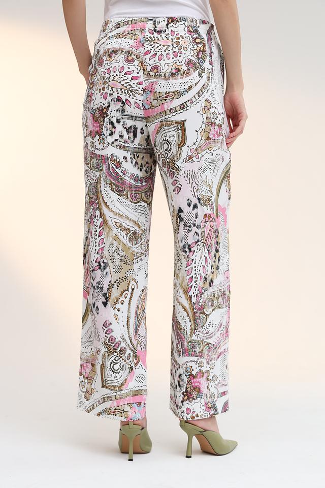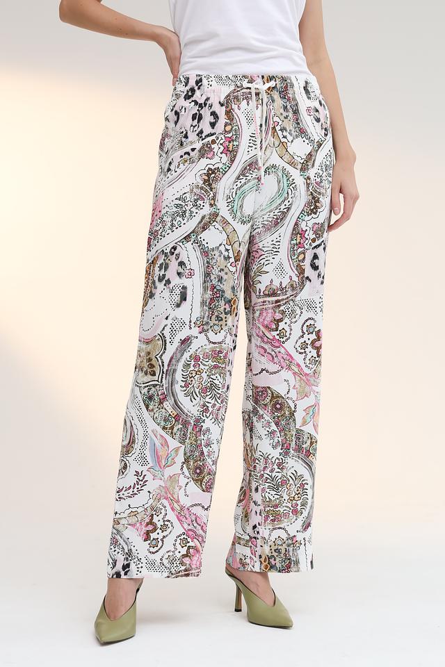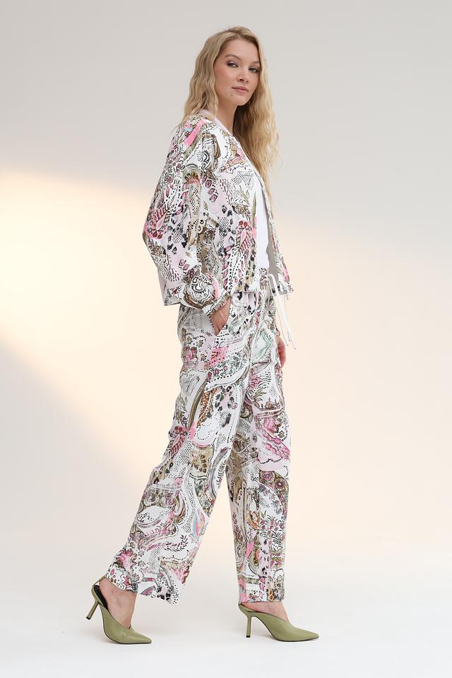 Брюки имеют свободный крой и пояс на резинке, благодаря чему идеально сидят по фигуре и не сковывают движений. Особенностью модели является эффектный принт пейсли, выполненный в разнообразных оттенках – от розового до зеленого и золотистого.