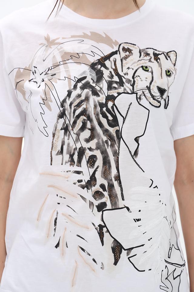 Белая футболка Marc Cain с оригинальным принтом тигра станет стильным дополнением к вашему гардеробу. Изготовлена из 100% хлопка, обеспечивая комфорт и воздухопроницаемость. Состав: хлопок 100%