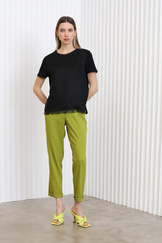 Блуза имеет свободный крой, который обеспечивает комфорт в носке. Короткие рукава и округлый вырез горловины делают её идеальным выбором для тёплой погоды. Особый акцент в дизайне – необработанный низ с декоративной бахромой, добавляющий образу лёгкую небрежность и оригинальность.