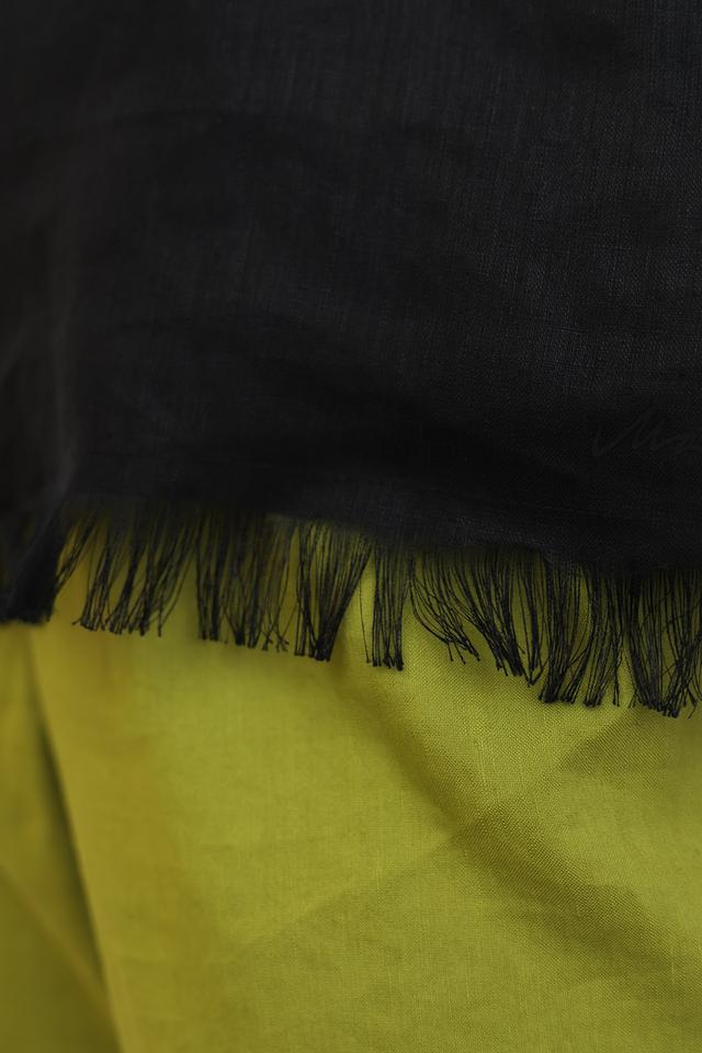 Чёрная блуза от Marc Cain из хлопка с эластаном. Модель свободного кроя с короткими рукавами и необработанным низом, декорированным бахромой, придаёт образу лёгкость и непринуждённость. Состав: хлопок 95%, эластан 5%