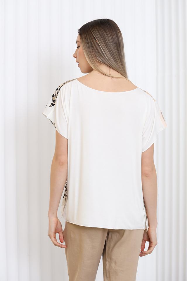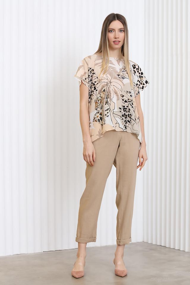 Блуза имеет свободный крой и короткие рукава, что делает ее удобной и легкой в носке. Особенностью модели является яркий и запоминающийся принт, сочетающий в себе изображения тропических растений и леопардовых пятен. Цветовая гамма блузы выполнена в бежевых и коричневых тонах, что придает ей элегантность и универсальность.
