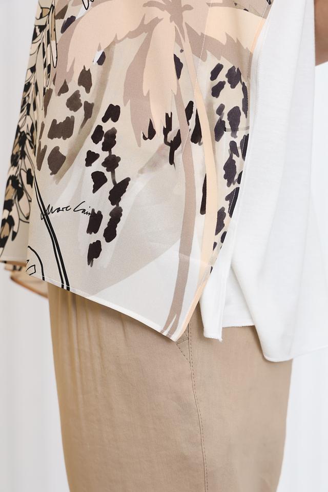 Бежевая блуза Marc Cain с оригинальным принтом в виде тропических растений и леопардовых пятен. Изготовлена из 100% шелка, что обеспечивает комфорт и элегантный внешний вид. Состав: шелк 100%