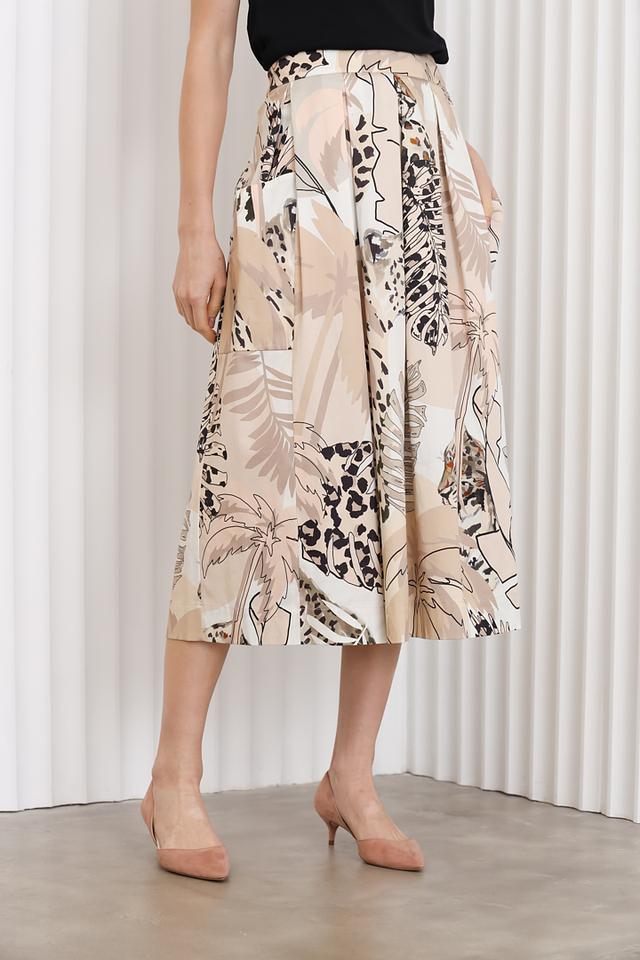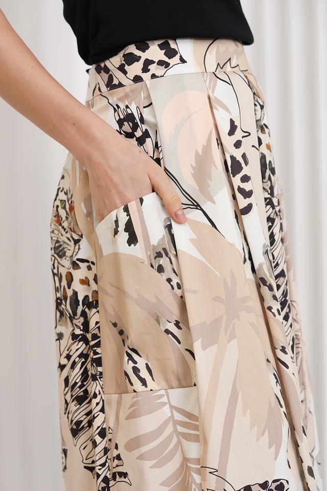 Юбка имеет приталенный силуэт и длину миди, что делает ее универсальной для различных случаев. Особенностью модели является яркий и необычный принт, сочетающий в себе изображения тропических листьев и леопардовых пятен в бежевой гамме. Такой рисунок добавляет юбке оригинальности и привлекательности.