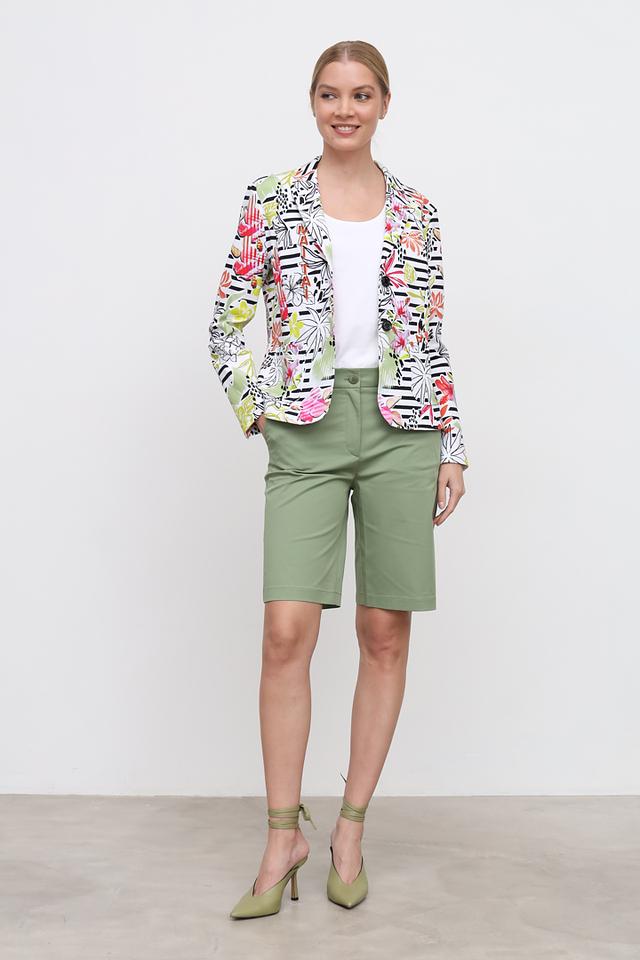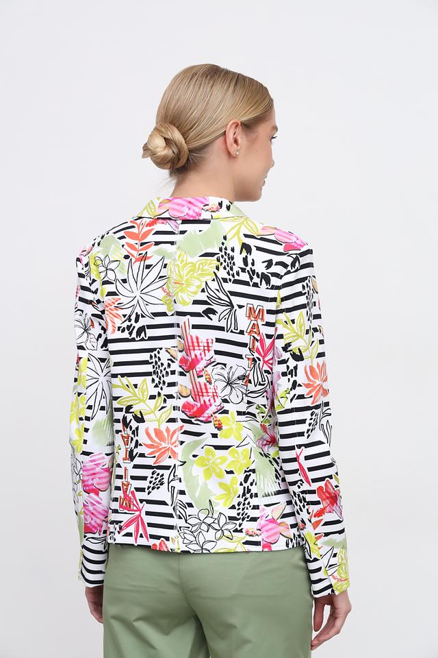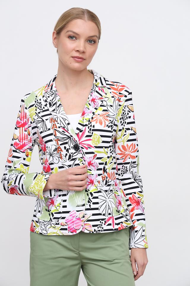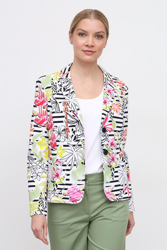 Жакет имеет классический крой с лацканами и длинными рукавами. Его украшает оригинальный цветочный принт, сочетающий в себе яркие оттенки розового, зеленого, желтого и черного цветов. Застежка на одну пуговицу подчеркивает силуэт.