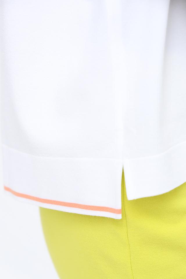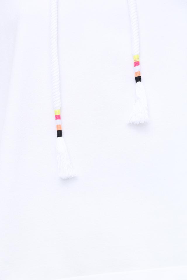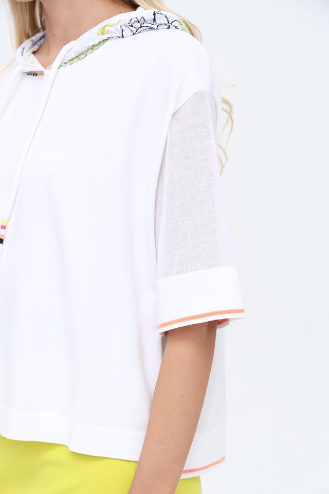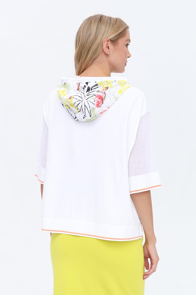 Белый пуловер от Marc Cain с короткими рукавами и капюшоном, декорированным цветочным принтом. Модель выполнена из мягкой вискозы с добавлением полиэстера, обеспечивающей комфорт и удобство в носке. Состав: вискоза 70%, полиэстер 30%