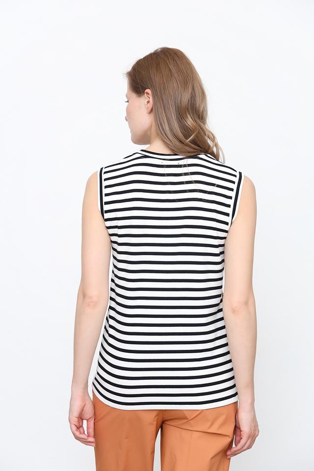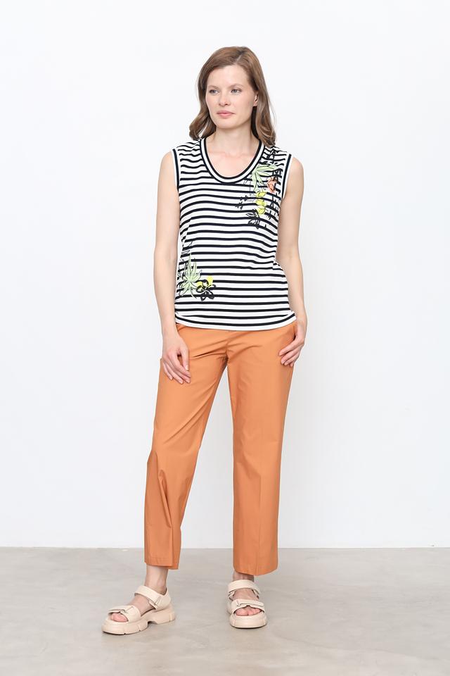 Топ Marc Cain в классическую полоску, дополненный ярким цветочным принтом. Модель без рукавов с округлым вырезом горловины, выполнена из мягкого хлопка с добавлением эластана. Состав: хлопок 94%, эластан 6%