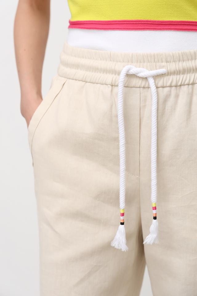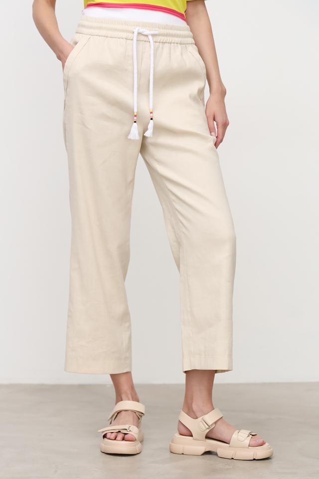 Брюки имеют прямой крой, укороченную длину и пояс на резинке с декоративными шнурками. Боковые карманы добавляют функциональности и практичности.