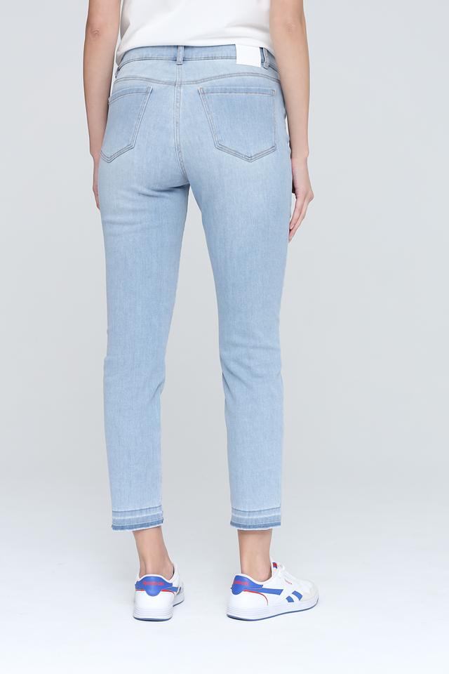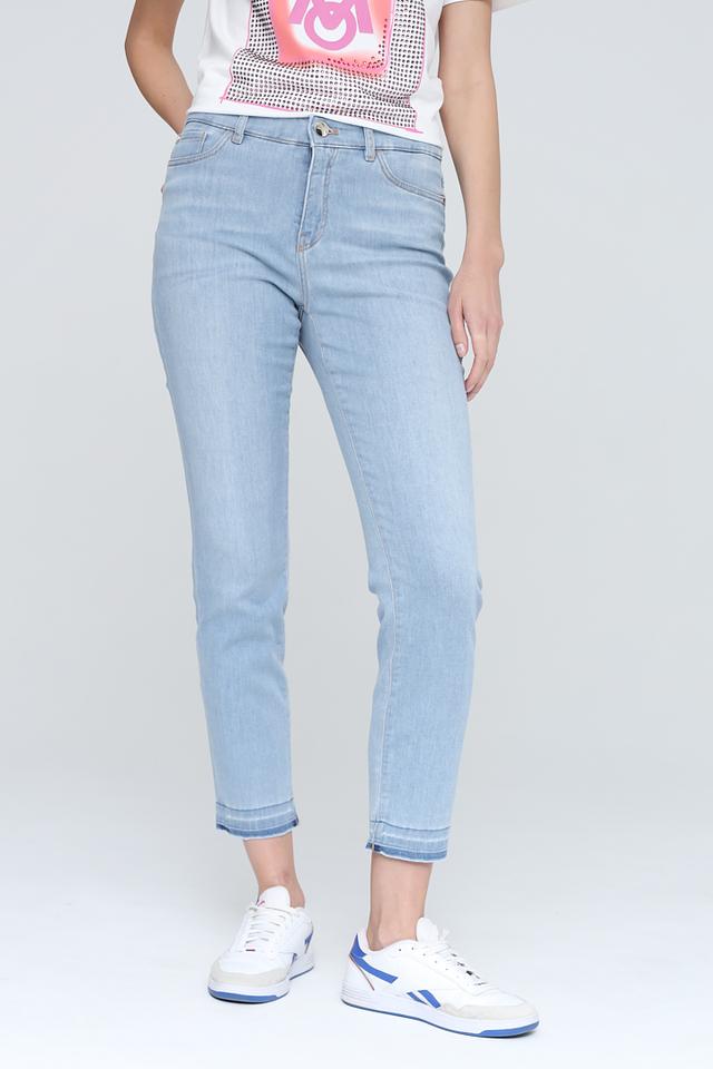 Женские джинсы Marc Cain голубого цвета с зауженным к низу силуэтом и манжетами. Модель выполнена из качественного хлопка с добавлением эластана для комфортной посадки и свободы движений. Состав: хлопок 92%, эластомультиэстер 6%, эластан 2%
