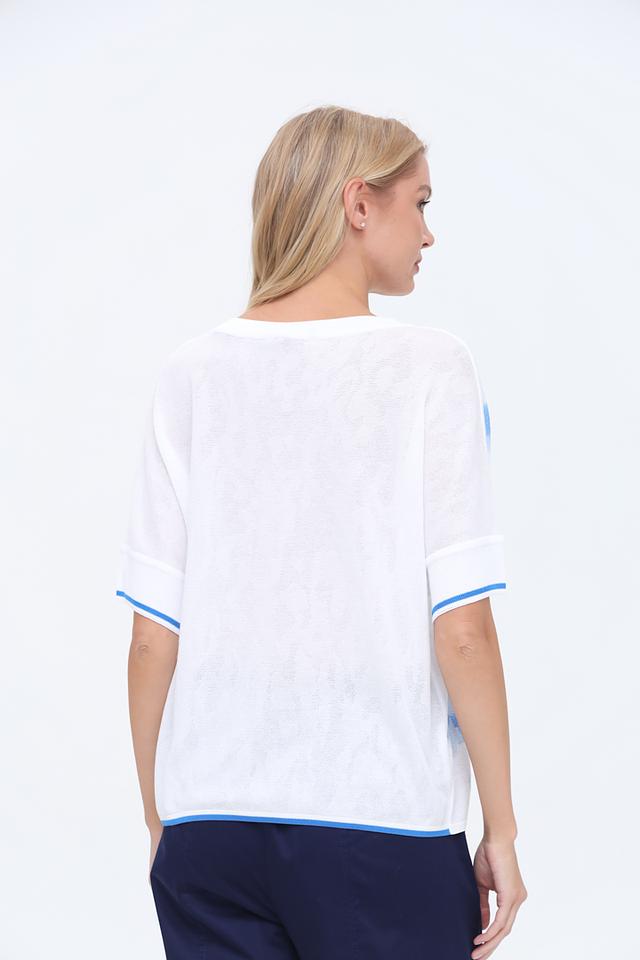 Пуловер имеет свободный крой, который обеспечивает комфортную посадку по фигуре. Короткие рукава и округлый вырез горловины делают его идеальным для теплой погоды. Отделка манжет в тон добавляет завершенности образу.