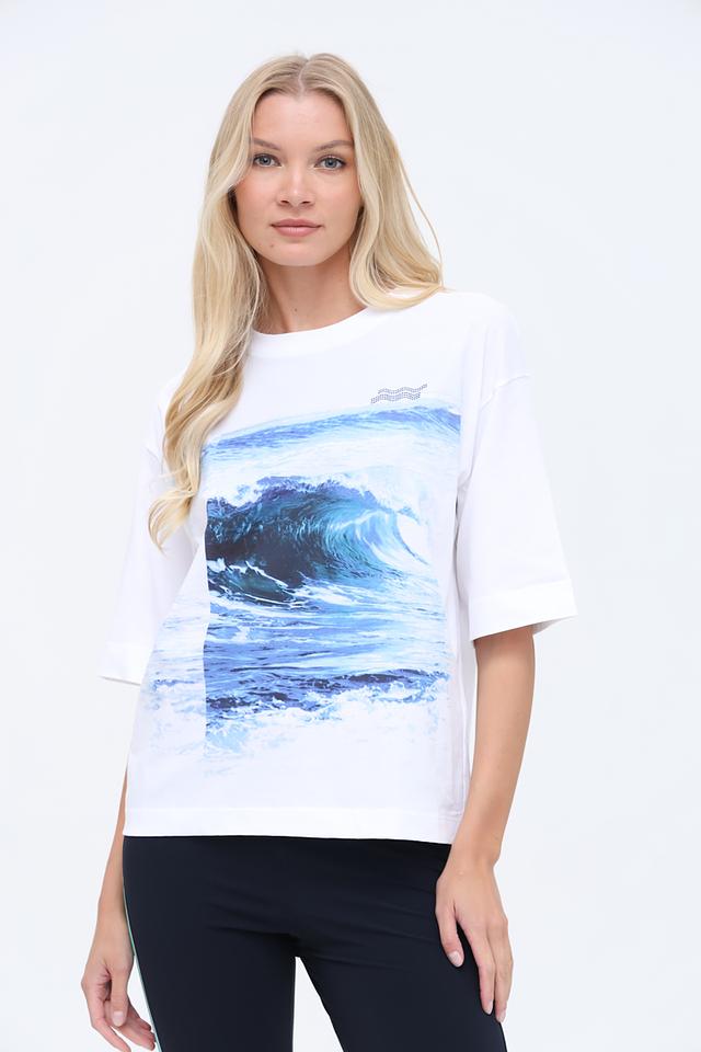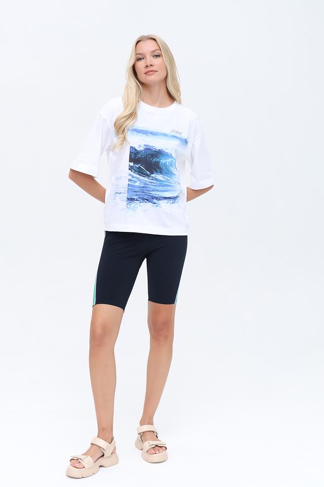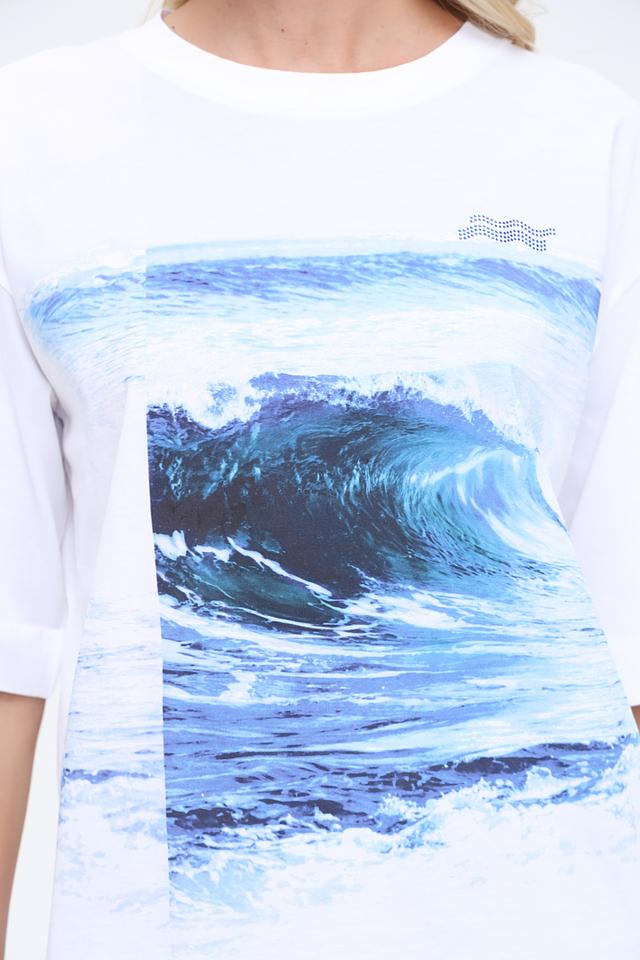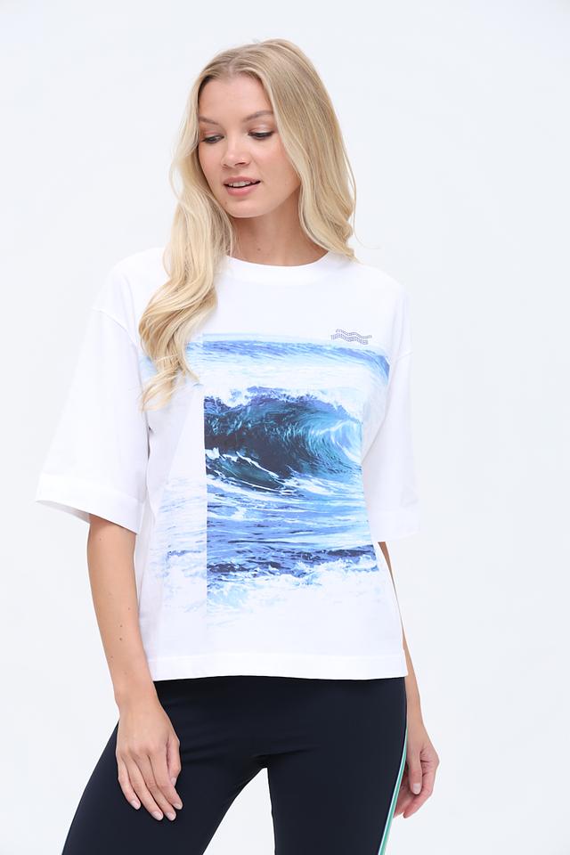 Белая футболка Marc Cain с ярким принтом морской волны. Модель свободного кроя из 100% хлопка обеспечит комфорт и удобство в повседневной носке. Состав: хлопок 100%