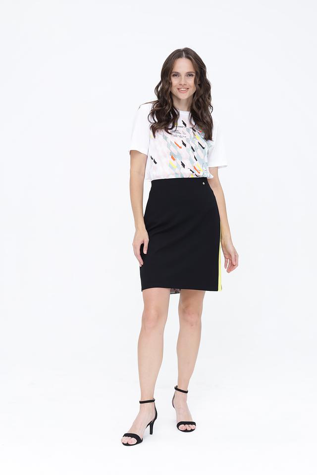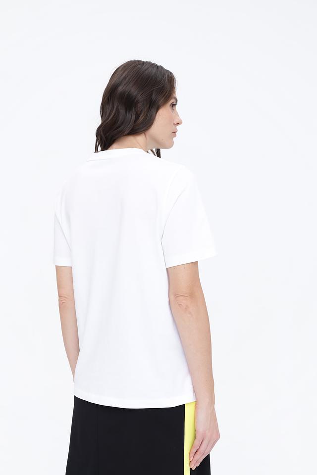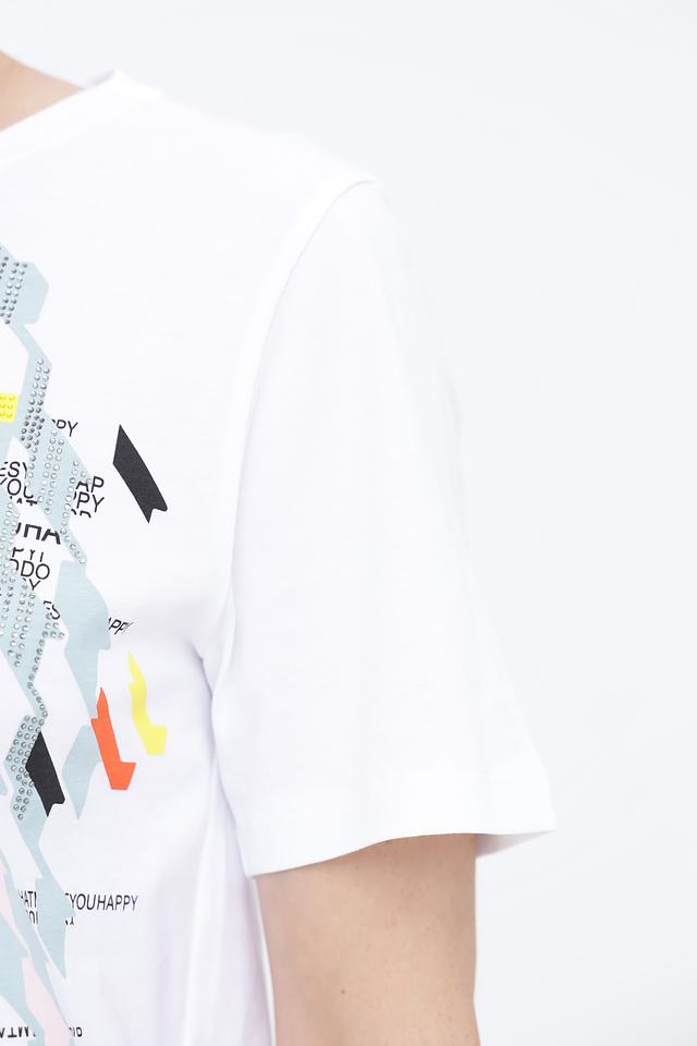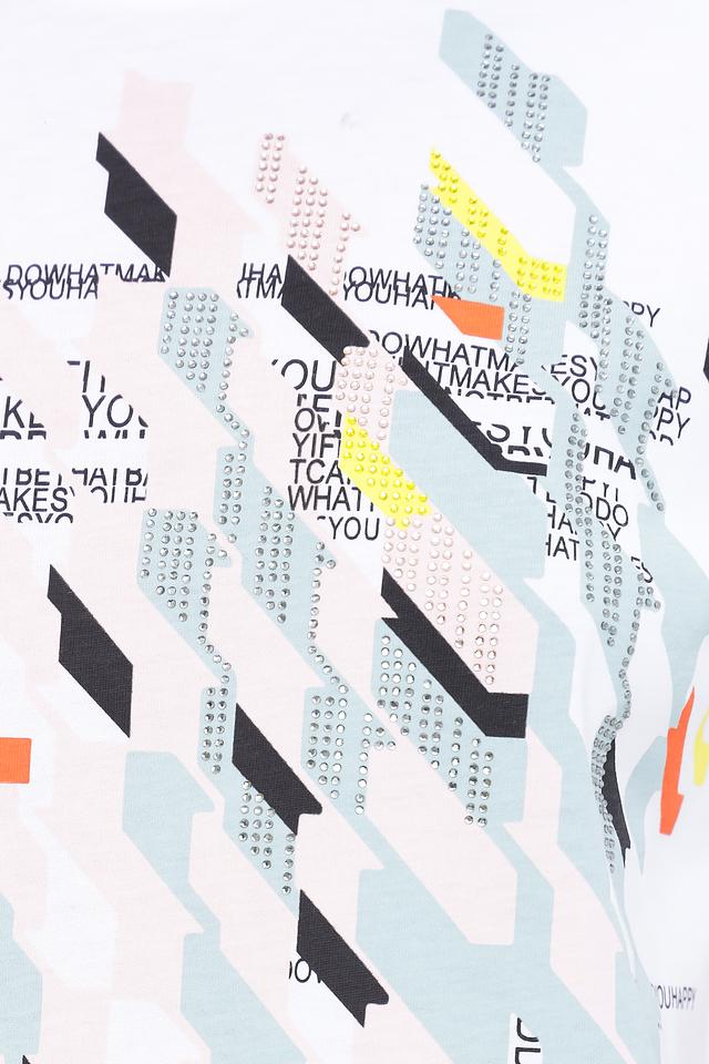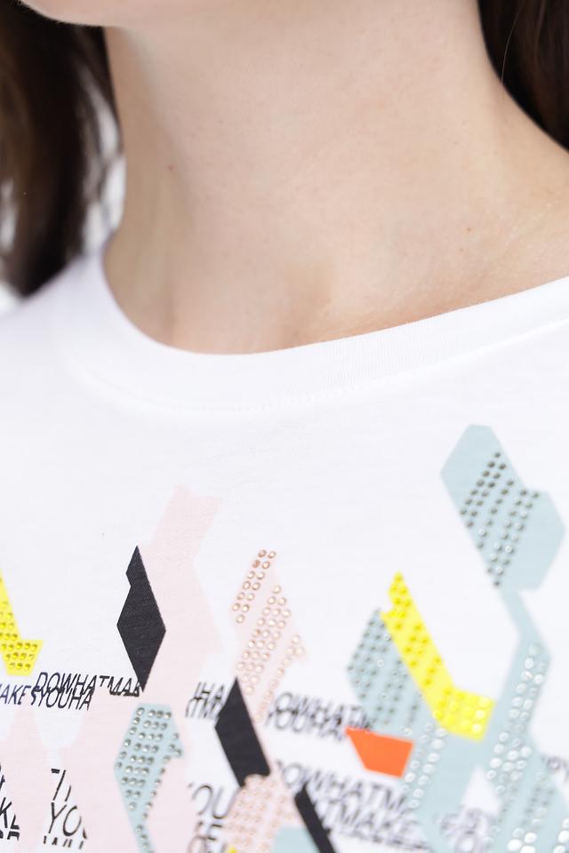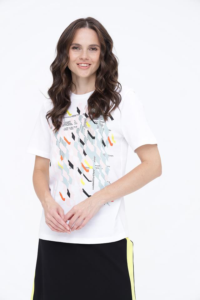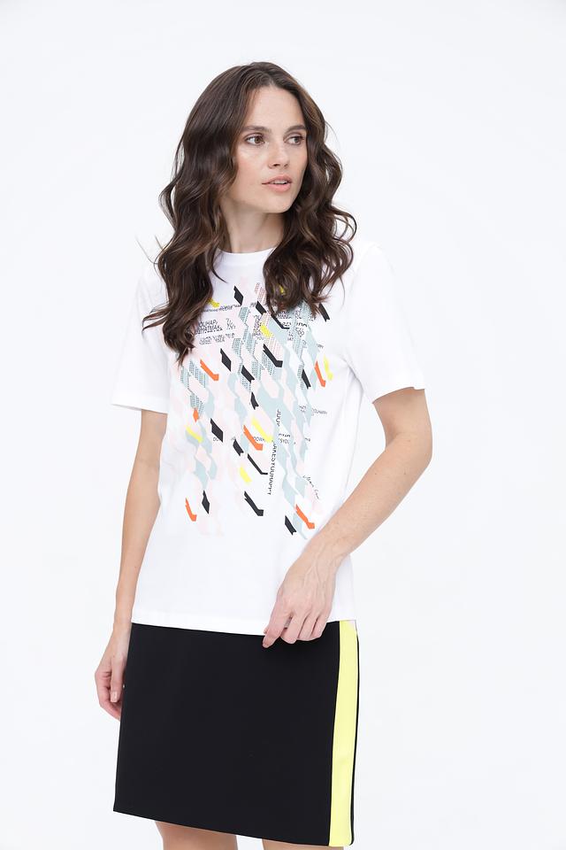 Белая футболка Marc Cain с ярким геометрическим принтом. Модель из 100% хлопка отличается свободным кроем и короткими рукавами, идеально подходит для создания повседневных образов. Состав: хлопок 100%