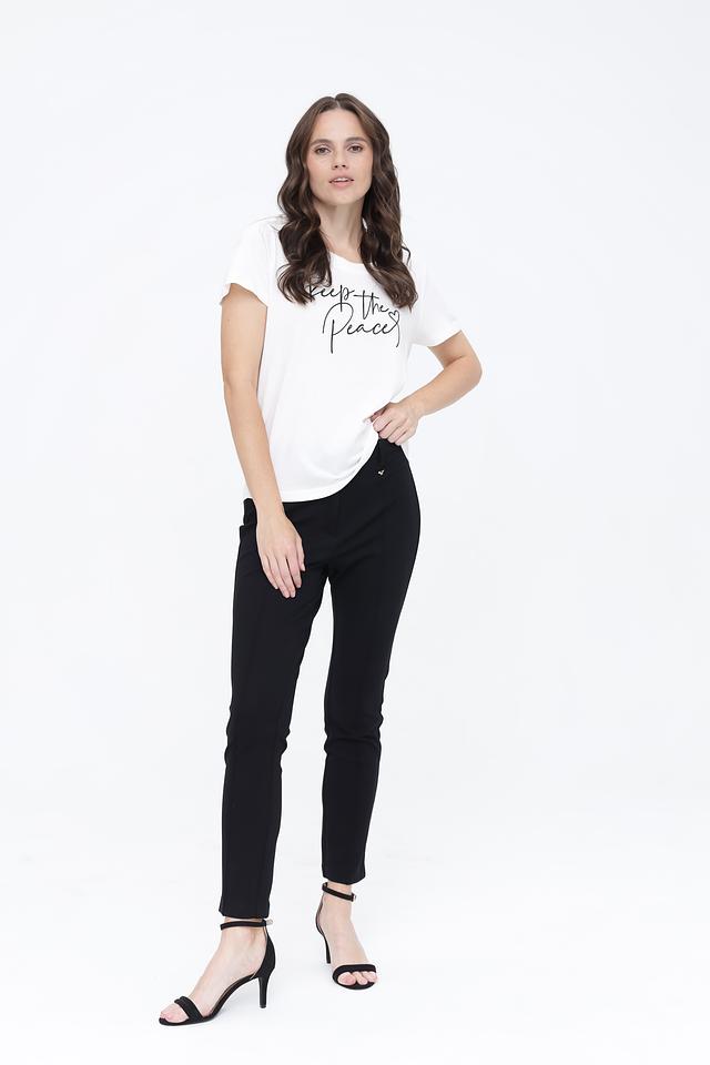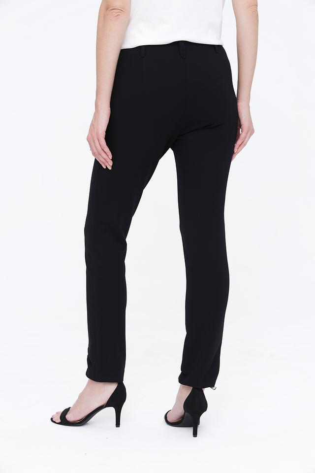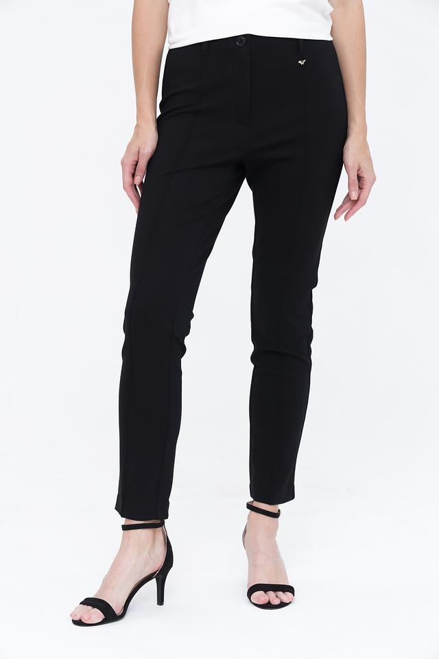 Брюки имеют прямой крой и стандартную посадку по фигуре, обеспечивая комфорт при носке. Ткань, состоящая из вискозы, полиамида и эластана, приятна к телу и хорошо держит форму.