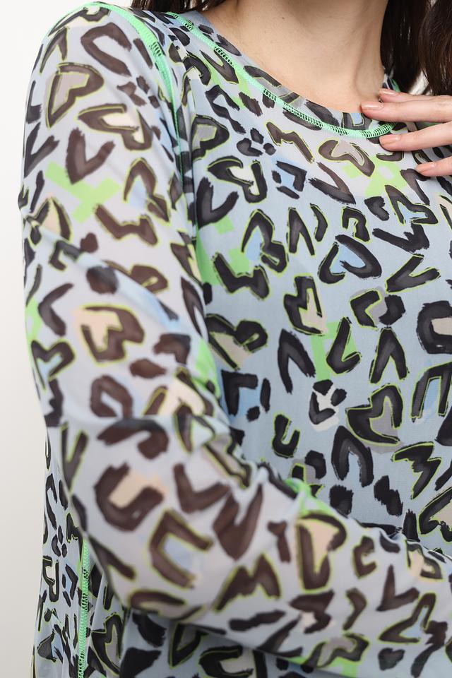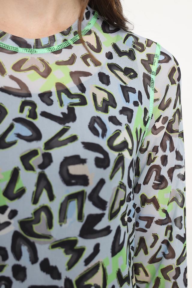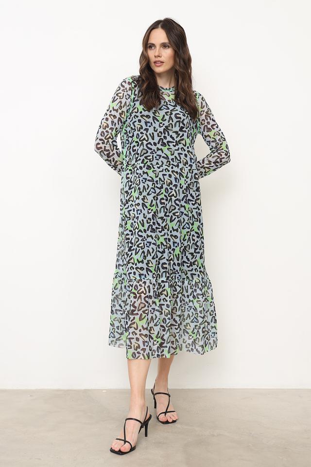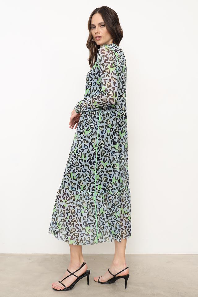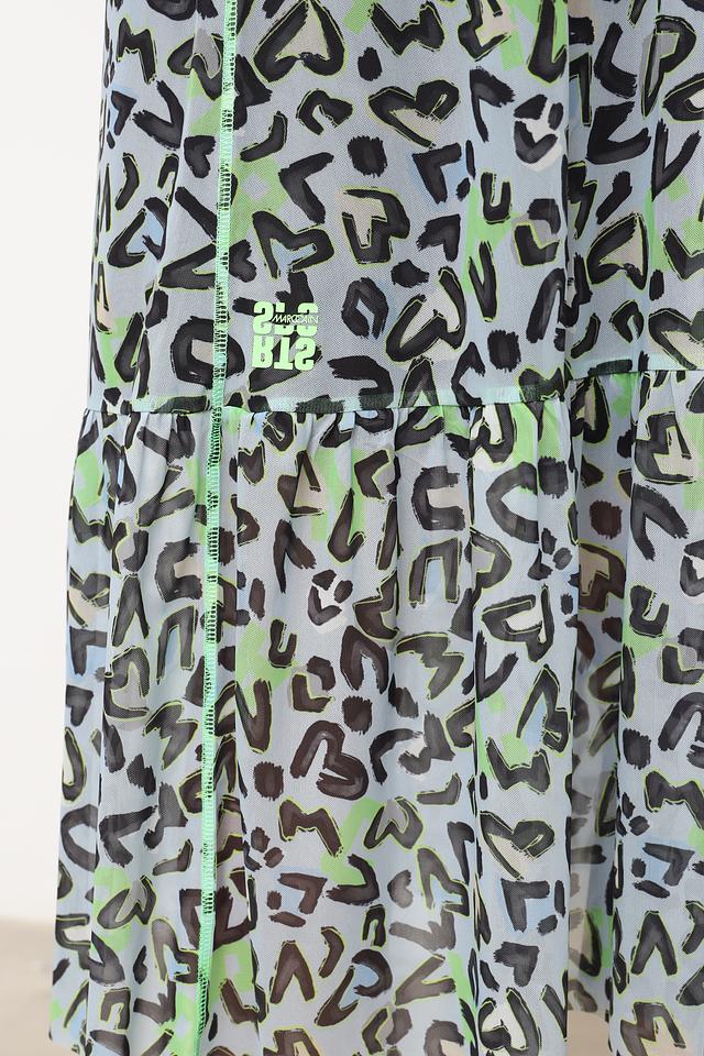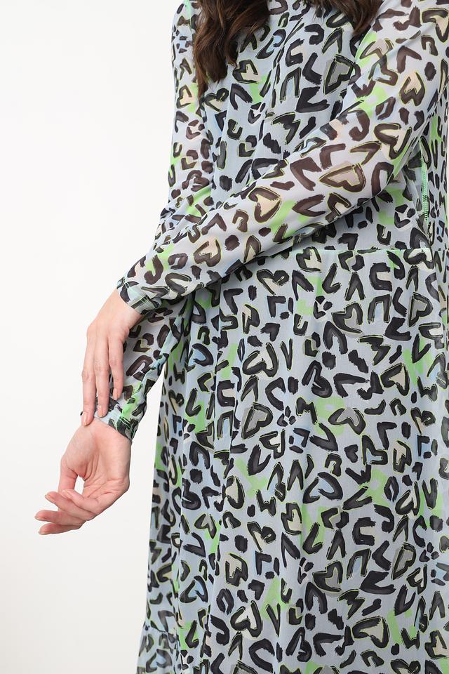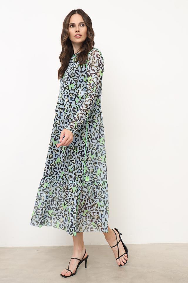 Это элегантное платье от Marc Cain выполнено из легкой и воздушной ткани, состоящей из 90% полиэстера и 10% эластана. Преобладающий цвет платья – голубой, украшенный ярким леопардовым принтом в оттенках зеленого и серого.
