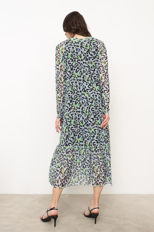 Платье имеет длину миди, длинные рукава и круглый вырез горловины. Полупрозрачная ткань придает модели легкость и изящество. Расклешенная юбка обеспечивает свободу движений и создает женственный силуэт.