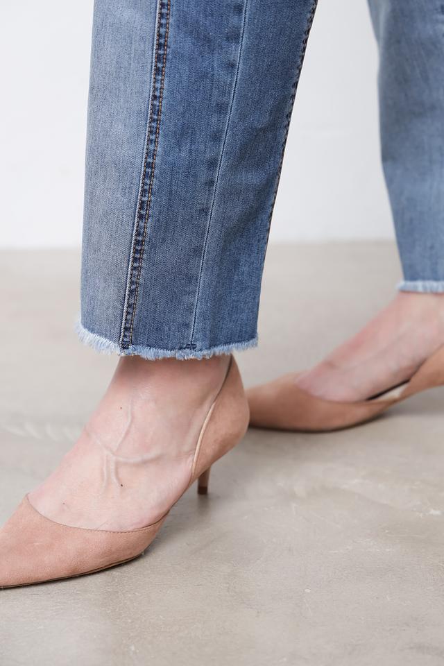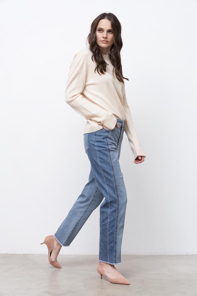 Джинсы имеют прямой крой, который обеспечивает свободу движений и комфортную посадку. Высокая посадка подчеркивает талию и создает элегантный силуэт. Застежка на молнию и пуговицу, а также пять карманов – два спереди и три сзади – добавляют функциональности.
