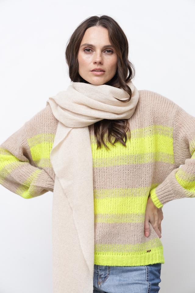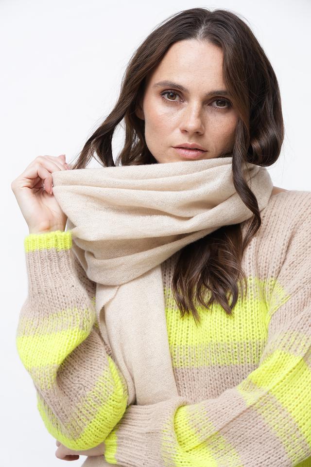 Этот элегантный шарф от Marc Cain станет прекрасным акцентом в вашем гардеробе. Шарф выполнен в бежевых тонах с добавлением полосатого узора, что придает ему современный и стильный вид.