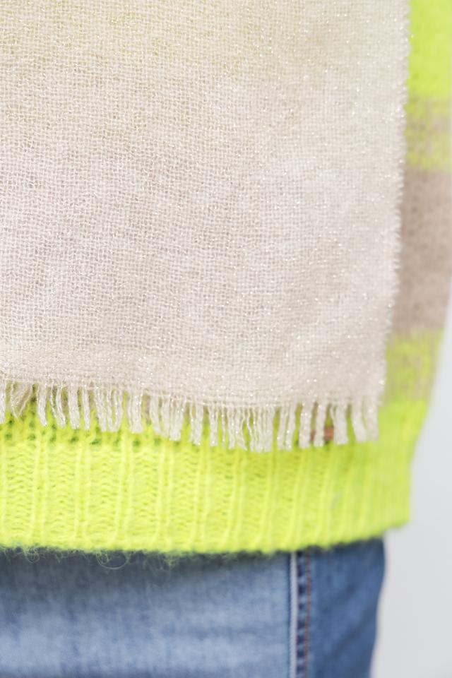 Шарф изготовлен из высококачественной смеси шерсти (77%) и кашемира (13%), что обеспечивает невероятную мягкость, тепло и комфорт при ношении. Добавление металлизированного волокна (10%) придает изделию легкий блеск и изысканность.