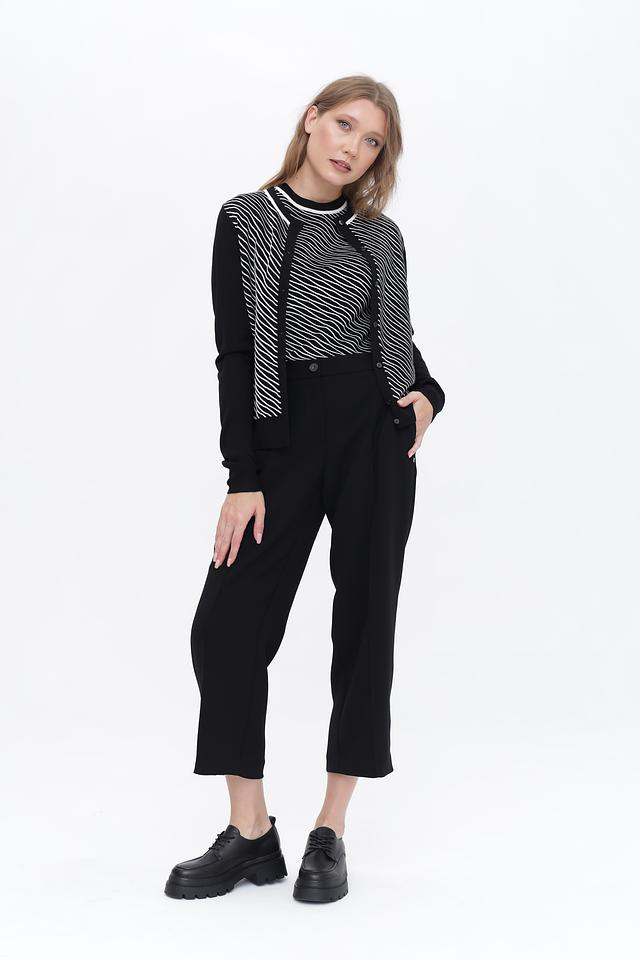 Брюки имеют прямой крой и укороченную длину, что придает им современный и модный вид. Высокая посадка подчеркивает талию и обеспечивает комфортную посадку. Застежка на пуговицу и молнию гарантирует надежность и удобство.
