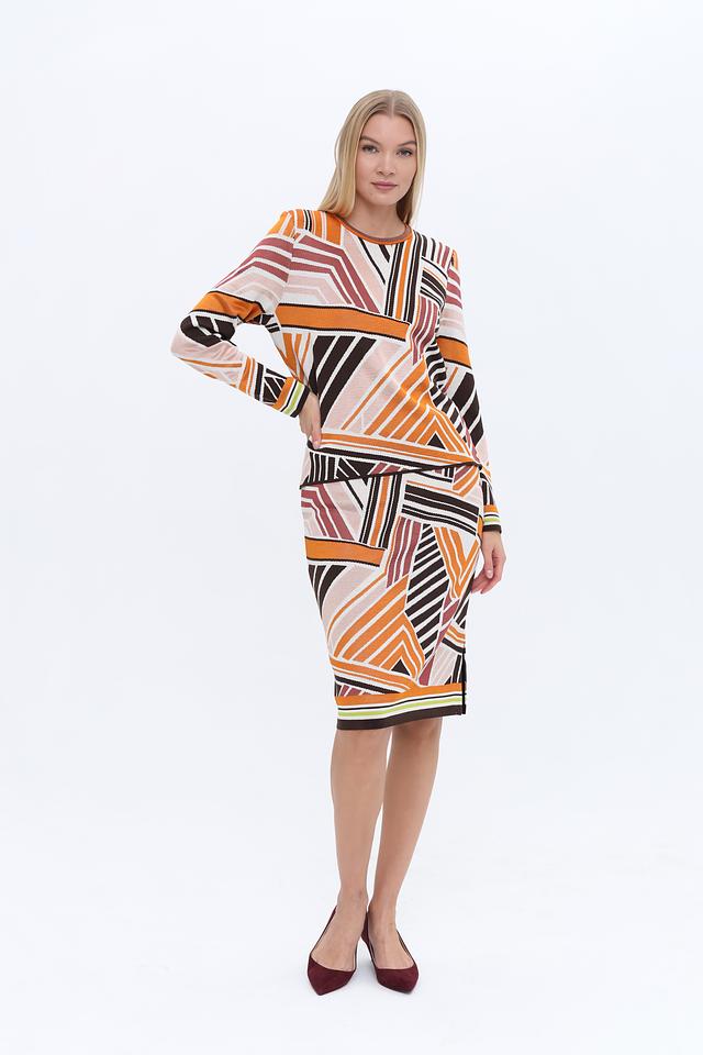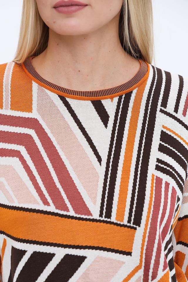 Женский пуловер Marc Cain оранжево-коричневого цвета с ярким геометрическим принтом. Модель выполнена из мягкой вискозы с добавлением хлопка и полиэстера, обеспечивающих комфорт и износостойкость. Состав: вискоза 59%, хлопок 39%, полиэстер 2%